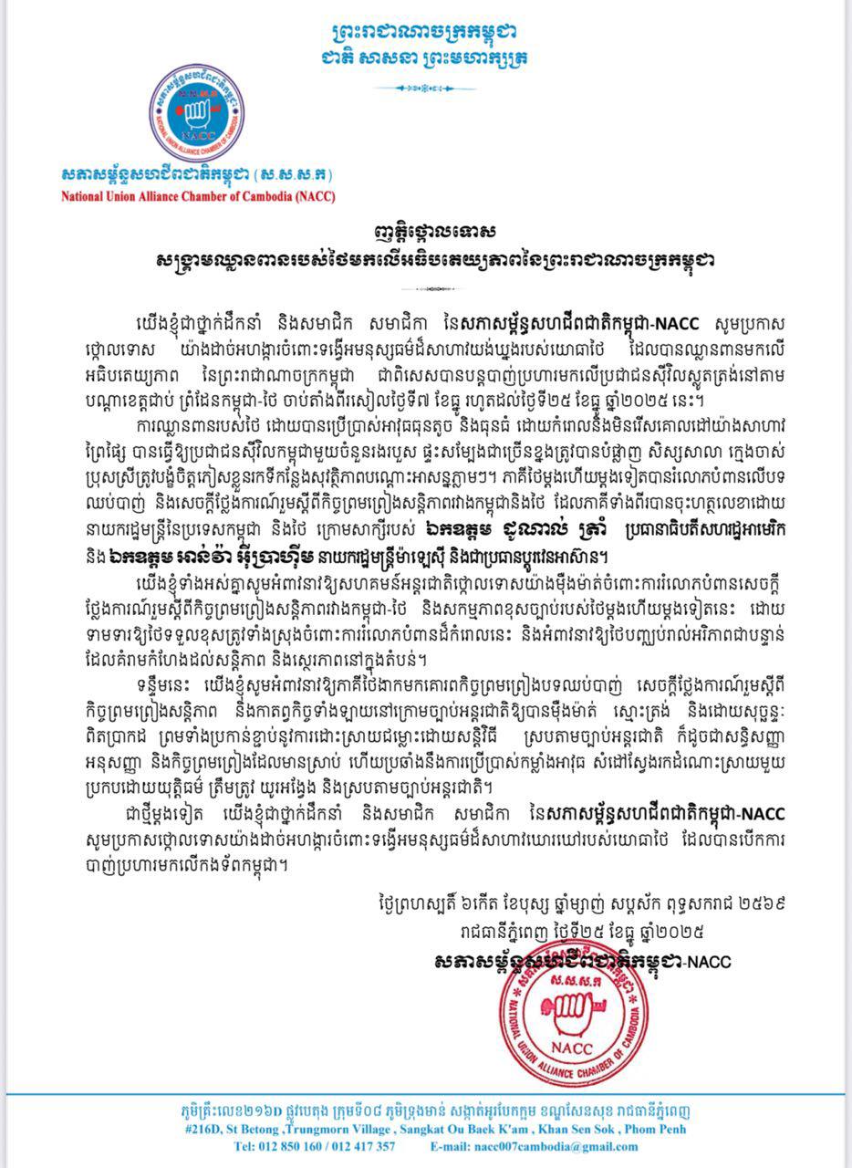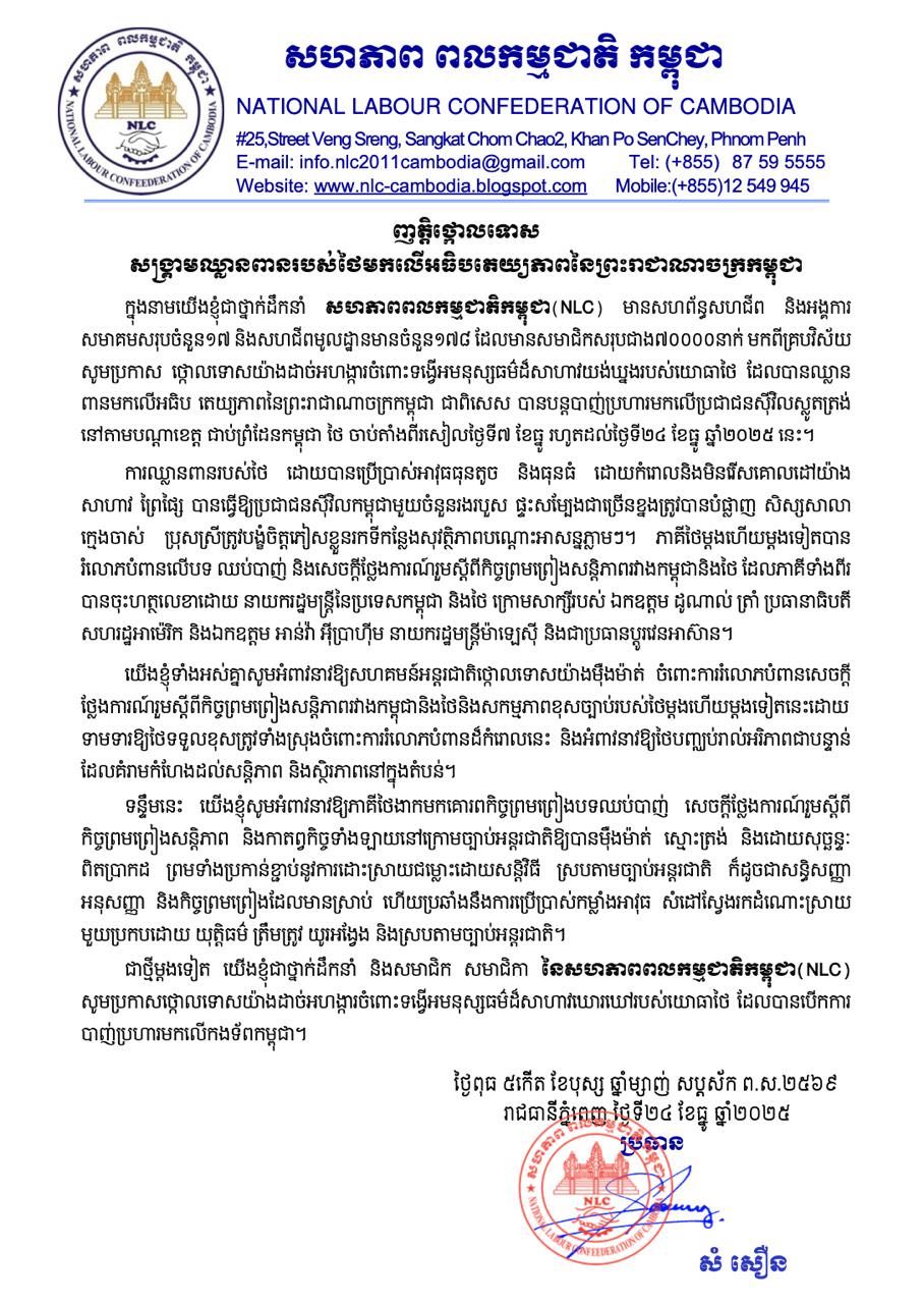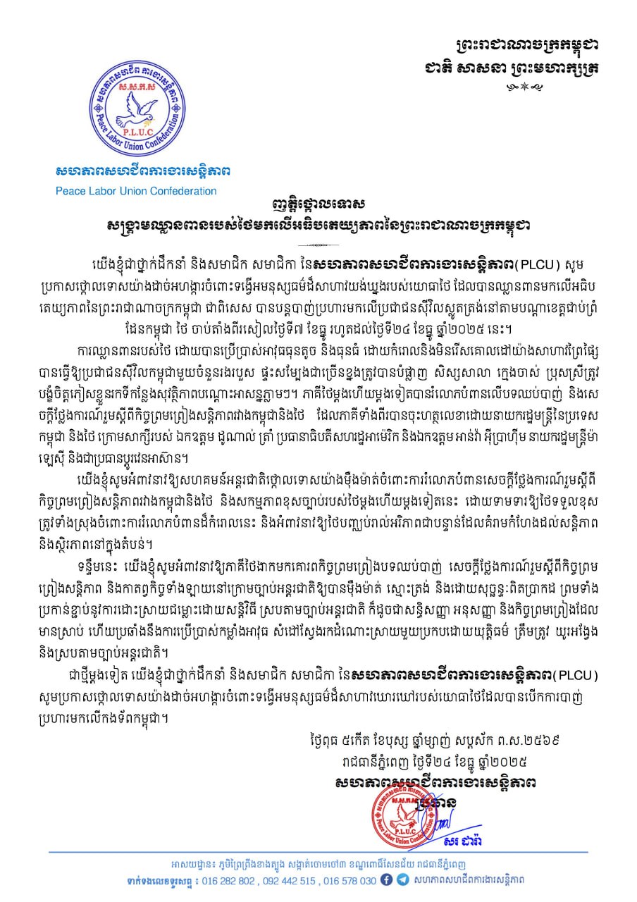(ភ្នំពេញ)៖ សហជីពនៅកម្ពុជា នៅថ្ងៃទី២៥ ខែធ្នូ ឆ្នាំ២០២៥ បានចេញញត្តិថ្កោលទោសយ៉ាងដាច់អហង្ការ ចំពោះទង្វើអមនុស្សធម៌ដ៏សាហាវយង់ឃ្នងរបស់យោធាថៃ ដែលបានឈ្លានពានមកលើអធិបតេយ្យភាពនៃព្រះរាជាណាចក្រកម្ពុជា ជាពិសេស បានបន្តបាញ់ប្រហារមកលើប្រជាជនស៊ីវិលស្លូតត្រង់នៅតាម បណ្តាខេត្តជាប់ព្រំដែនកម្ពុជា ថៃ ចាប់តាំងពីរសៀលថ្ងៃទី៧ ខែធ្នូ រហូតដល់ថ្ងៃទី២៤ ខែធ្នូ ឆ្នាំ២០២៥នេះ។