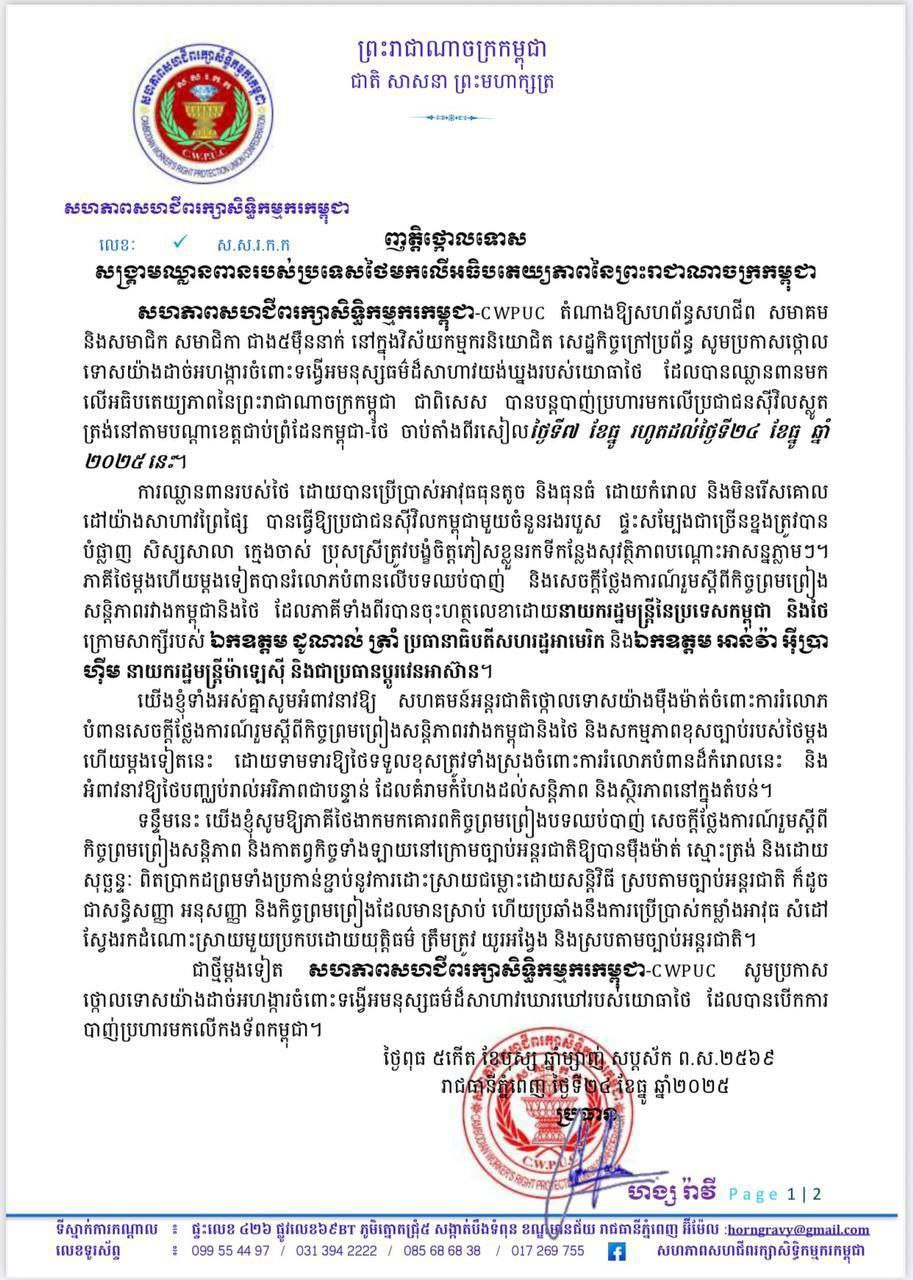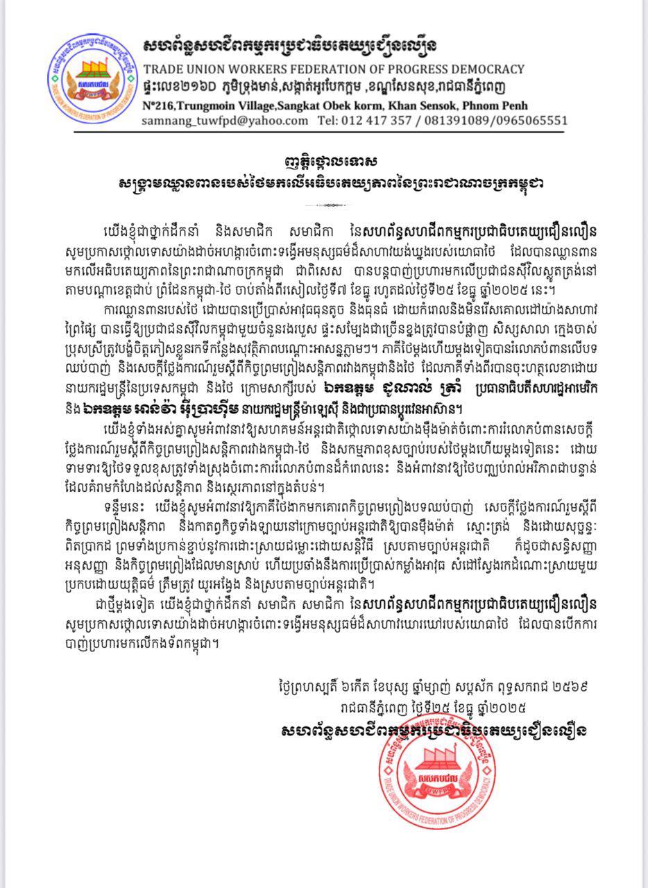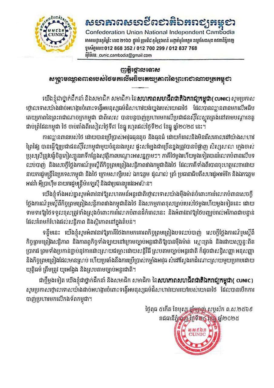 សហជីពនៅកម្ពុជា ចេញញត្តិថ្កោលទោស សង្គ្រាមឈ្លានពានរបស់ថៃមកលើអធិបតេយ្យភាពនៃព្រះរាជាណាចក្រកម្ពុជា