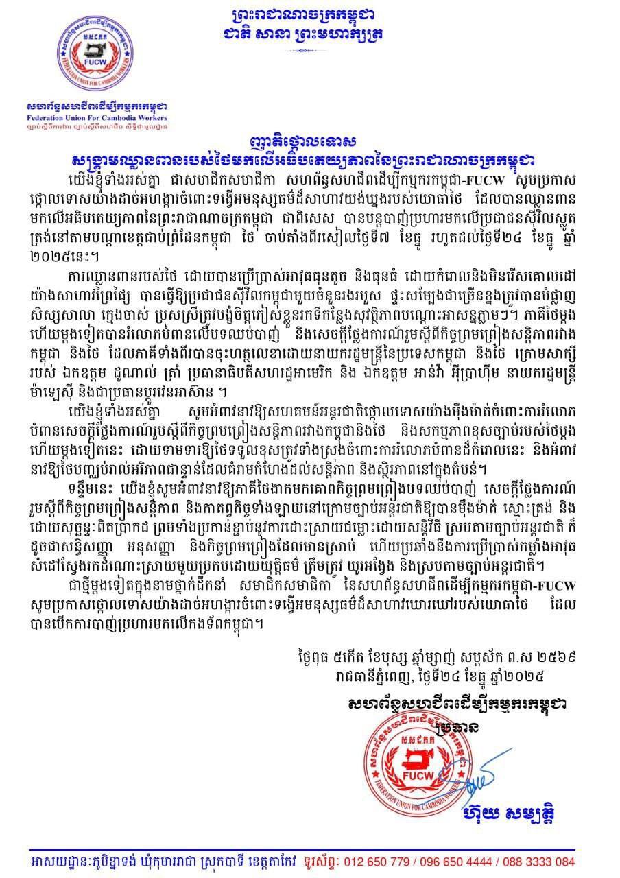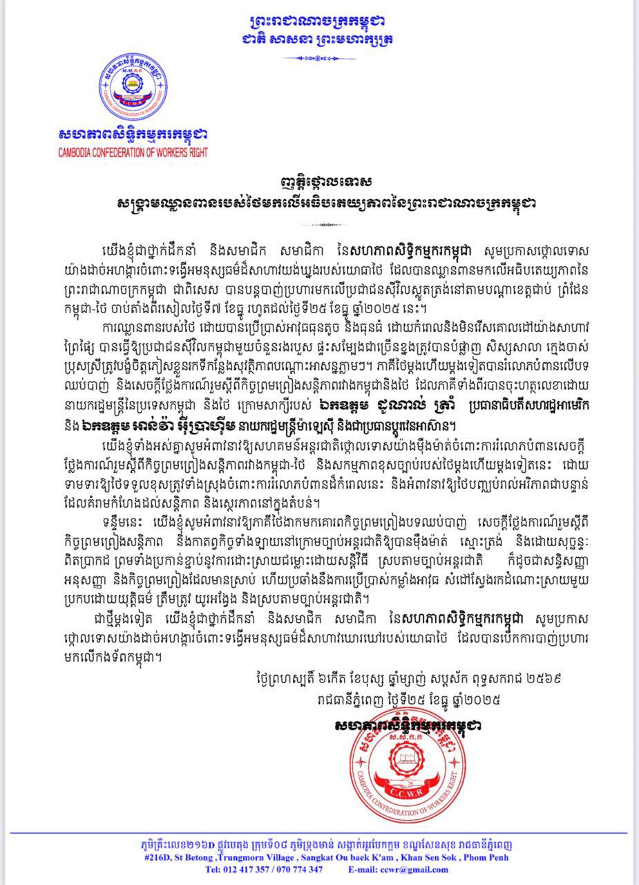 ជាមួយគ្នានេះ សហជីពនៅកម្ពុជា បានអំពាវនាវឱ្យសហគមន៍អន្តរជាតិថ្កោលទោសយ៉ាងម៉ឺងម៉ាត់ចំពោះការរំលោភបំពានសេចក្ដីថ្លែងការណ៍រួមស្ដីពី កិច្ចព្រមព្រៀងសន្តិភាពរវាងកម្ពុជានិងថៃ និងសកម្មភាពខុសច្បាប់របស់ថៃម្តងហើយម្តងទៀត ដោយទាមទារឱ្យថៃទទួលខុសត្រូវទាំងស្រុងចំពោះការរំលោភបំពានដ៏កំរោលនេះ និងអំពាវនាវឱ្យថៃបញ្ឈប់រាល់អរិភាពជាបន្ទាន់ ដែលគំរាមកំហែងដល់សន្តិភាព និងស្ថិរភាពនៅក្នុងតំបន់។