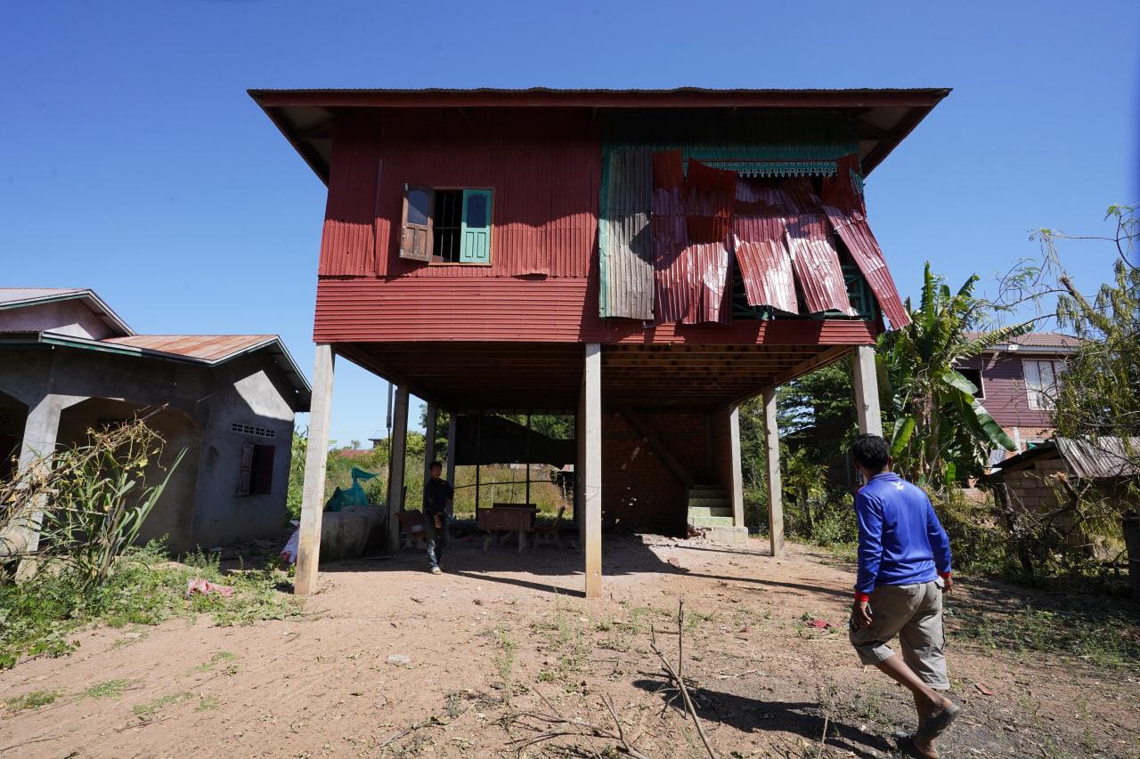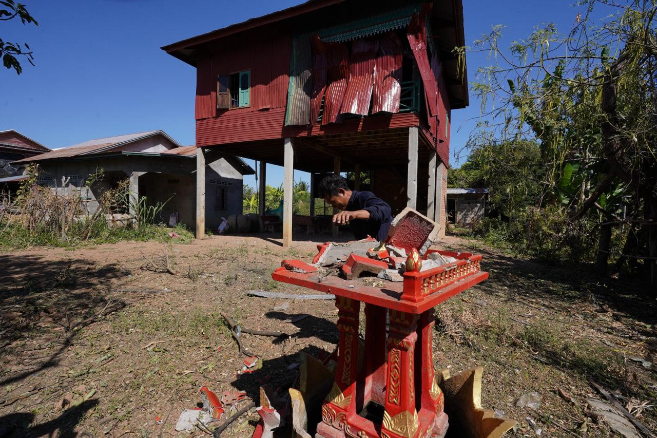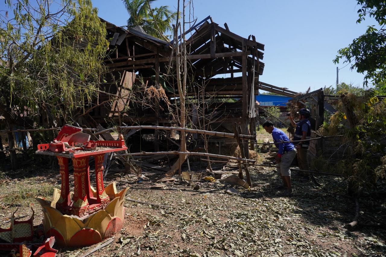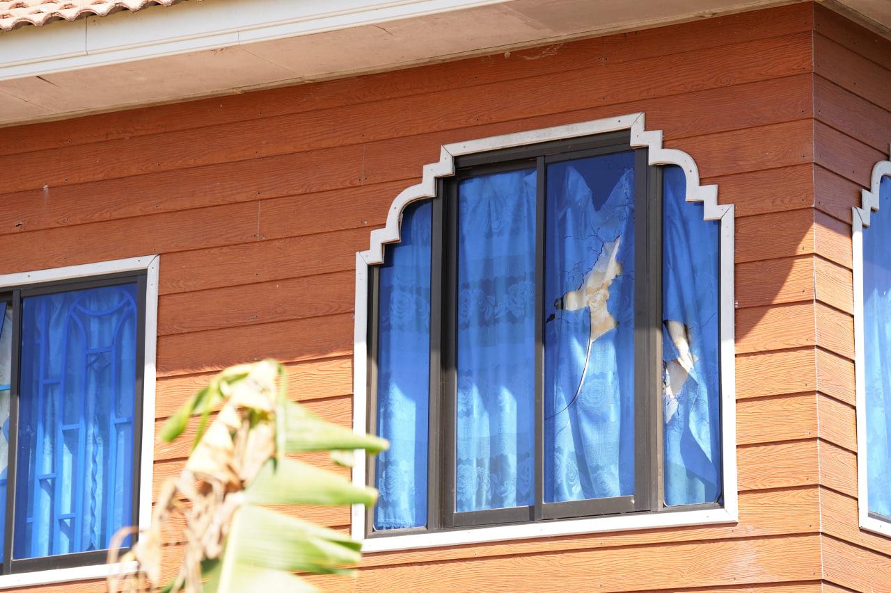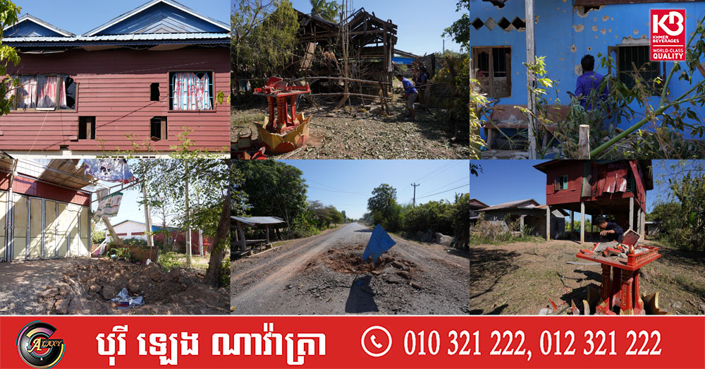 សមរភូមិខេត្តបន្ទាយមានជ័យ សន្ធឹកគ្រាប់បន្តលាន់ឮកងរំពង, អ្នកសារព័ត៌មានឆ្មក់ថតយករូបភាពផ្ទះសម្បែងនៅស្រុកស្វាយចេក ខូចខាតដោយសារទម្ងន់គ្រាប់ឈ្លានពានរបស់កងទ័ពថៃ