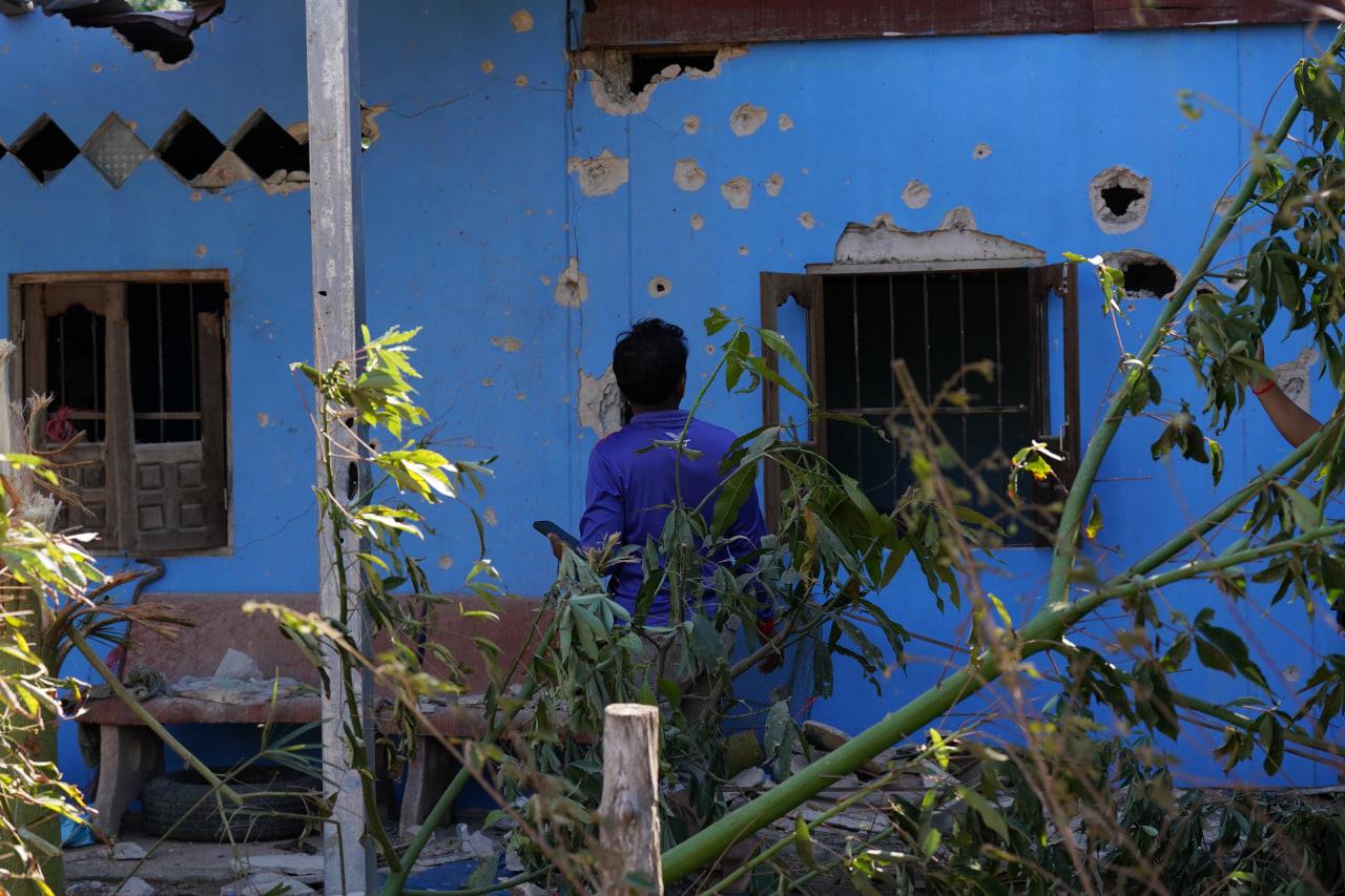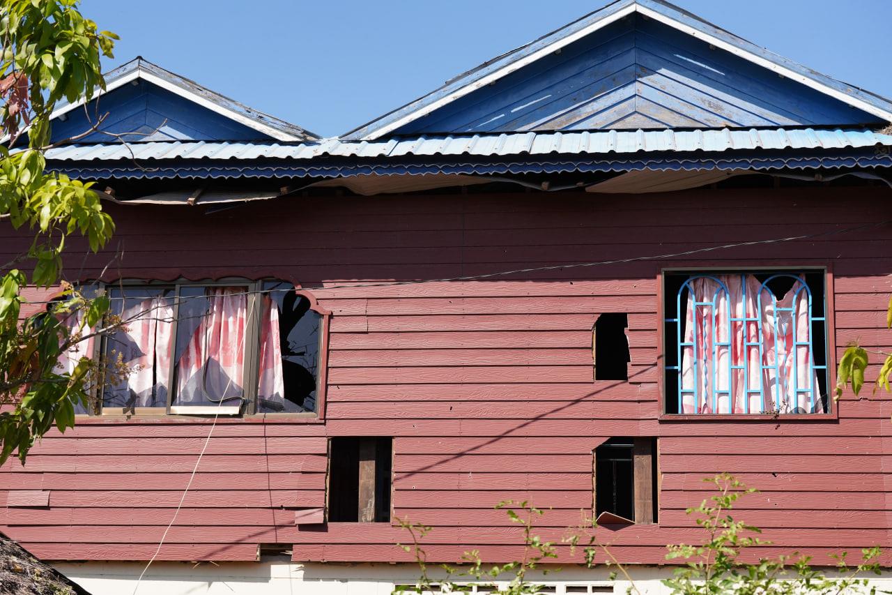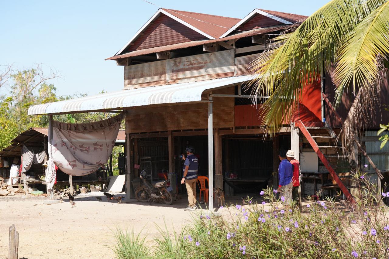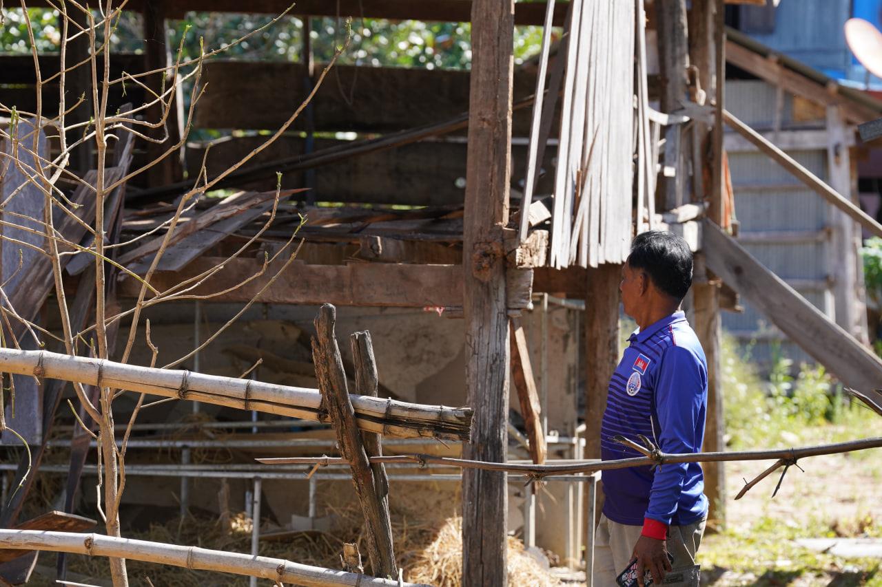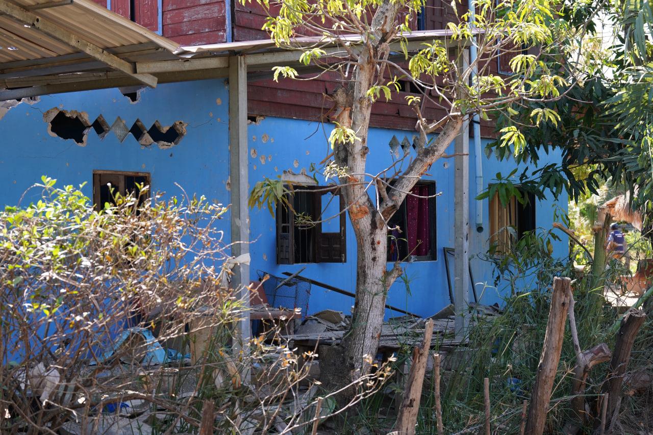 សមរភូមិខេត្តបន្ទាយមានជ័យ សន្ធឹកគ្រាប់បន្តលាន់ឮកងរំពង, អ្នកសារព័ត៌មានឆ្មក់ថតយករូបភាពផ្ទះសម្បែងនៅស្រុកស្វាយចេក ខូចខាតដោយសារទម្ងន់គ្រាប់ឈ្លានពានរបស់កងទ័ពថៃ