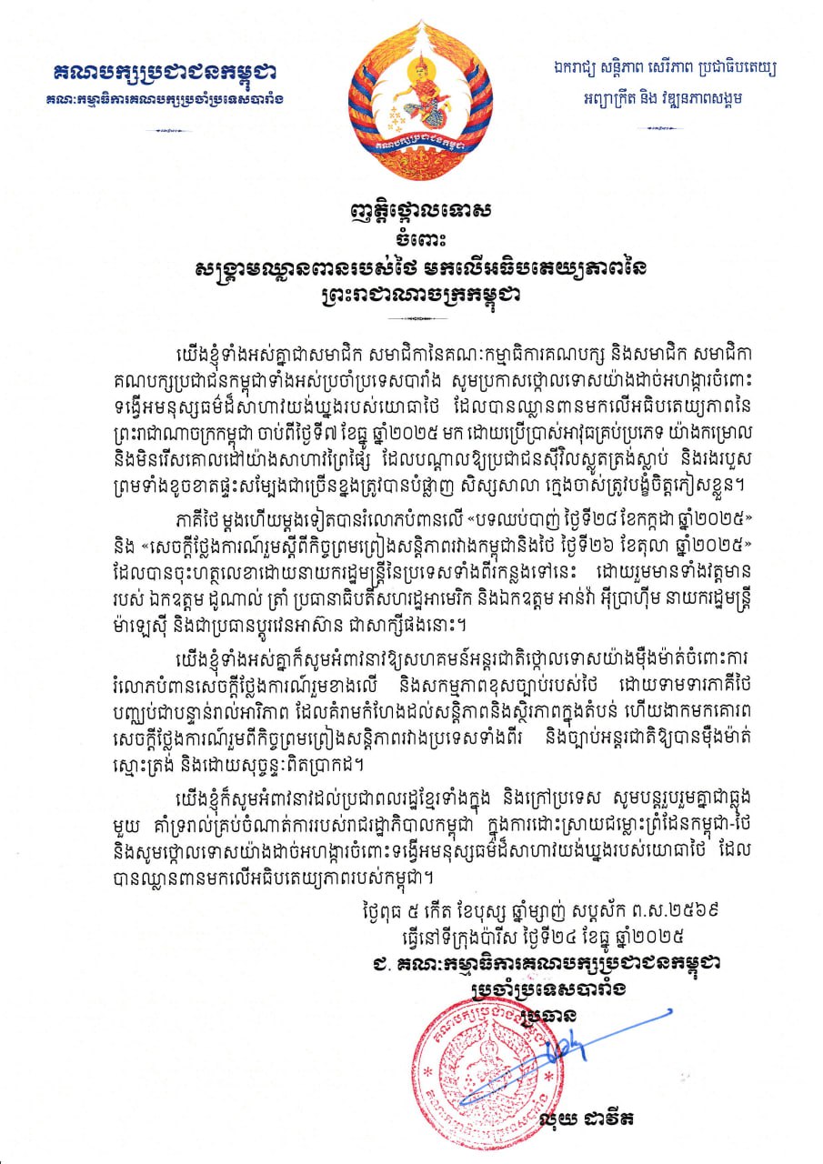 (ភ្នំពេញ)៖ គណៈកម្មាធិការគណបក្សប្រជាជនកម្ពុជាប្រចាំប្រទេសបារាំង សូមប្រកាសថ្កោលទោសយ៉ាងដាច់អហង្ការចំពោះទង្វើអមនុស្សធម៌ដ៏សាហាវយង់ឃ្នង របស់យោធាថៃ ដែលបានឈ្លានពានមកលើអធិបតេយ្យភាពនៃព្រះរាជាណាចក្រកម្ពុជា ជាពិសេសបានបន្តបាញ់ប្រហារមកលើប្រជាជនស៊ីវិលស្លូតត្រង់ នៅតាមបណ្តាខេត្តជាប់ព្រំដែនកម្ពុជា ថៃ ចាប់តាំងពីរសៀលថ្ងៃទី៧ ខែធ្នូ រហូតដល់ថ្ងៃទី២៤ ខែធ្នូ ឆ្នាំ២០២៥នេះ។
