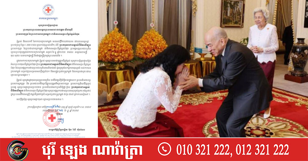 (ភ្នំពេញ)៖ សម្ដេចកិត្តិព្រឹទ្ធបណ្ឌិត ប៊ុន រ៉ានី ហ៊ុនសែន ប្រធានកាកបាទក្រហមកម្ពុជា នៅថ្ងៃទី២៥ ខែធ្នូ ឆ្នាំ២០២៥នេះ បានក្រាបបង្គំទូលថ្វាយនូវសារលិខិតថ្លែងអំណរព្រះរាជគុណថ្វាយ ព្រះករុណា ព្រះបាទសម្តេចព្រះបរមនាថ នរោត្តម សីហមុនី ព្រះមហាក្សត្រនៃព្រះរាជាណាចក្រកម្ពុជា ជាទីគោរពសក្ការៈដ៏ខ្ពង់ខ្ពស់បំផុត ដែលព្រះអង្គសព្វព្រះរាជហឫទ័យប្រោសព្រះរាជូបត្ថម្ភនូវព្រះរាជទ្រព្យចំនួន ១ពាន់ដុល្លារ ចំពោះកាកបាទក្រហមកម្ពុជា សម្រាប់ខែធ្នូ ឆ្នាំ២០២៥។