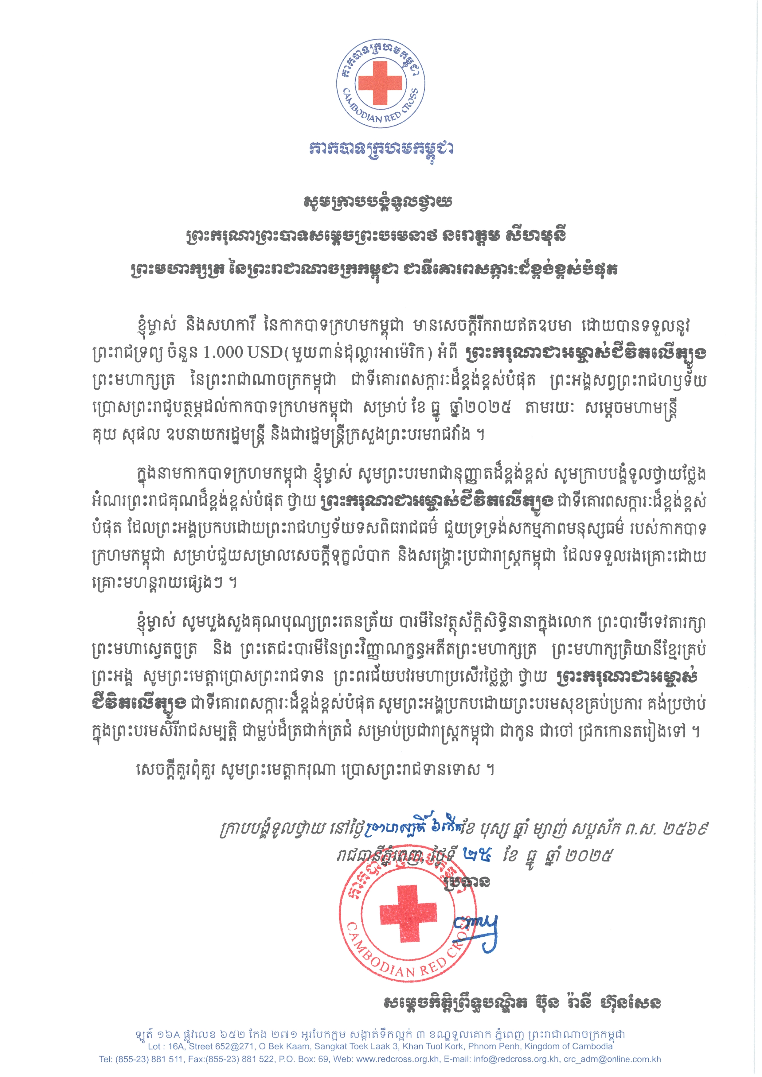 ក្នុងសារលិខិតនោះមានខ្លឹមសារថា «ខ្ញុំម្ចាស់ និងសហការី នៃកាកបាទក្រហមកម្ពុជា មានសេចក្តីរីករាយឥតឧបមា ដោយបានទទួលនូវ ព្រះរាជទ្រព្យ ចំនួន 1,000 USD (មួយពាន់ដុល្លារអាម៉េរិក) អំពី ព្រះករុណាជាអម្ចាស់ជីវិតលើត្បូង ព្រះមហាក្សត្រ នៃព្រះរាជាណាចក្រកម្ពុជា ជាទីគោរពសក្ការៈដ៏ខ្ពង់ខ្ពស់បំផុត ព្រះអង្គសព្វព្រះរាជហឫទ័យ ប្រោសព្រះរាជូបត្ថម្ភដល់កាកបាទក្រហមកម្ពុជា សម្រាប់ខែធ្នូ ឆ្នាំ២០២៥ តាមរយៈ សម្តេចមហាមន្ត្រី គុយ សុផល ឧបនាយករដ្ឋមន្ត្រី និងជារដ្ឋមន្ត្រីក្រសួងព្រះបរមរាជវាំង។