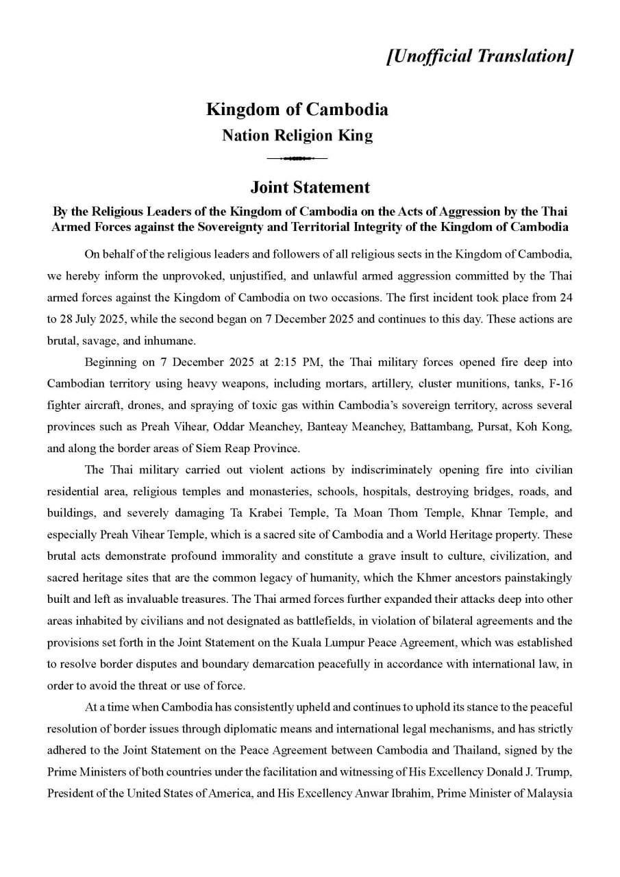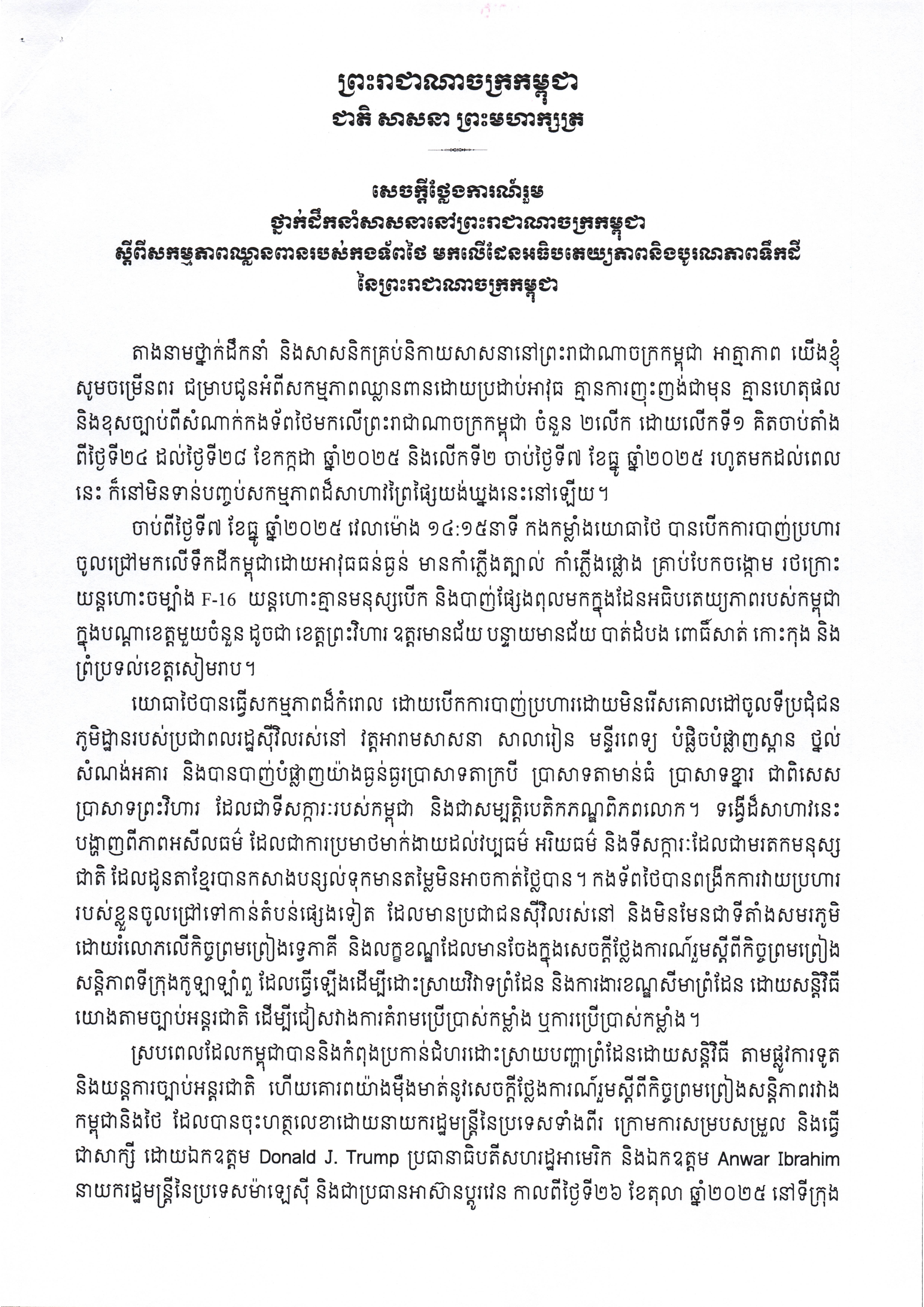 ក្នុងសេចក្ដីថ្លែងការណ៍រួម បានឲ្យដឹងថា «តាងនាមថ្នាក់ដឹកនាំ និងសាសនិកគ្រប់និកាយសាសនានៅព្រះរាជាណាចក្រកម្ពុជា អាត្មាភាព យើងខ្ញុំសូមចម្រើនពរ ជម្រាបជូនអំពីសកម្មភាពឈ្លានពានដោយប្រដាប់អាវុធ គ្មានការញុះញង់ជាមុន គ្មានហេតុផល និងខុសច្បាប់ពីសំណាក់កងទ័ពថៃមកលើព្រះរាជាណាចក្រកម្ពុជា ចំនួន ២លើក ដោយលើកទី១ គិតចាប់តាំង ពីថ្ងៃទី២៤ ដល់ថ្ងៃទី២៨ ខែកក្កដា ឆ្នាំ២០២៥ និងលើកទី២ ចាប់ថ្ងៃទី៧ ខែធ្នូ ឆ្នាំ២០២៥ រហូតមកដល់ពេល នេះ ក៏នៅមិនទាន់បញ្ចប់សកម្មភាពដ៏សាហាវព្រៃផ្សៃយង់ឃ្នងនេះនៅឡើយ។