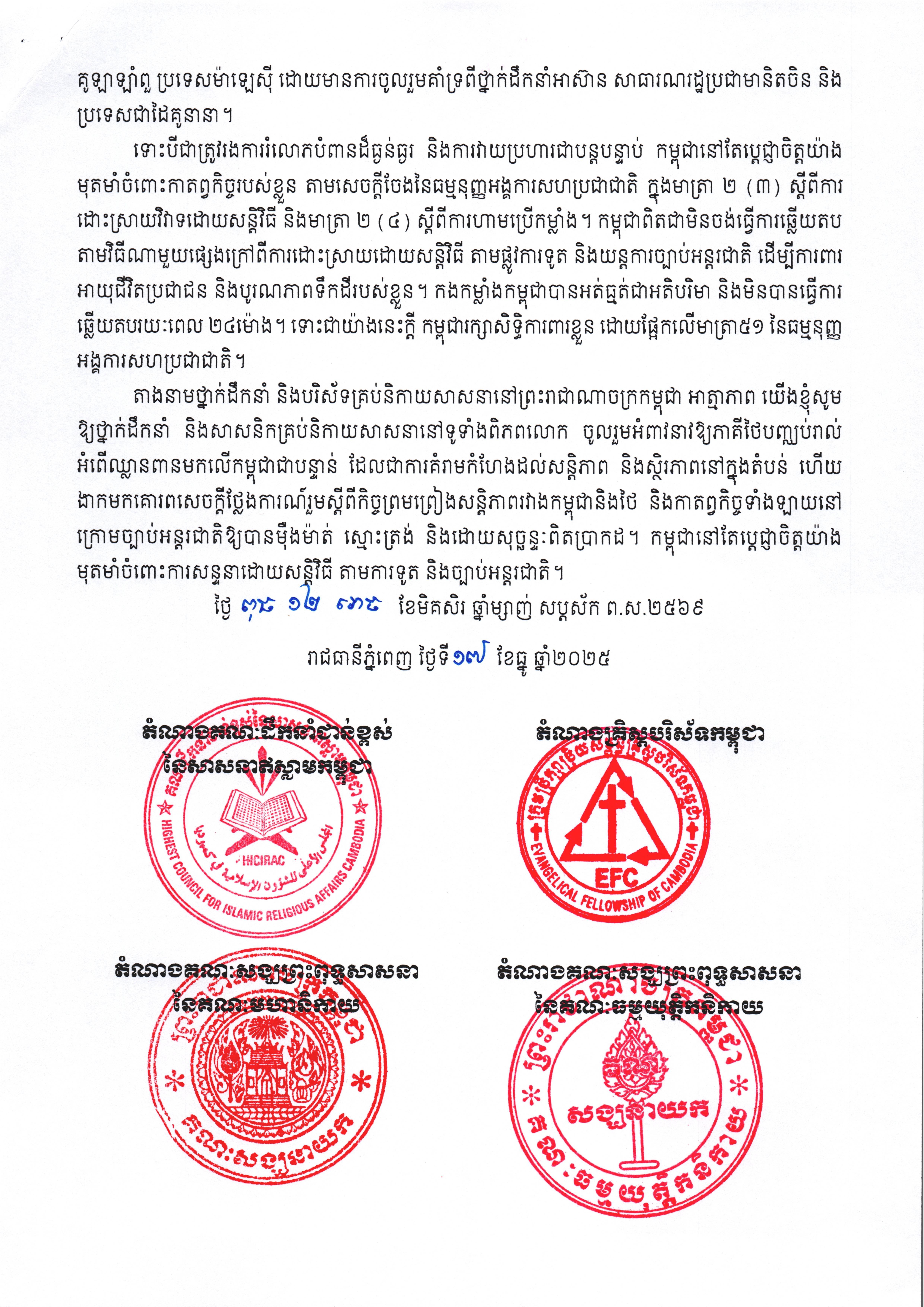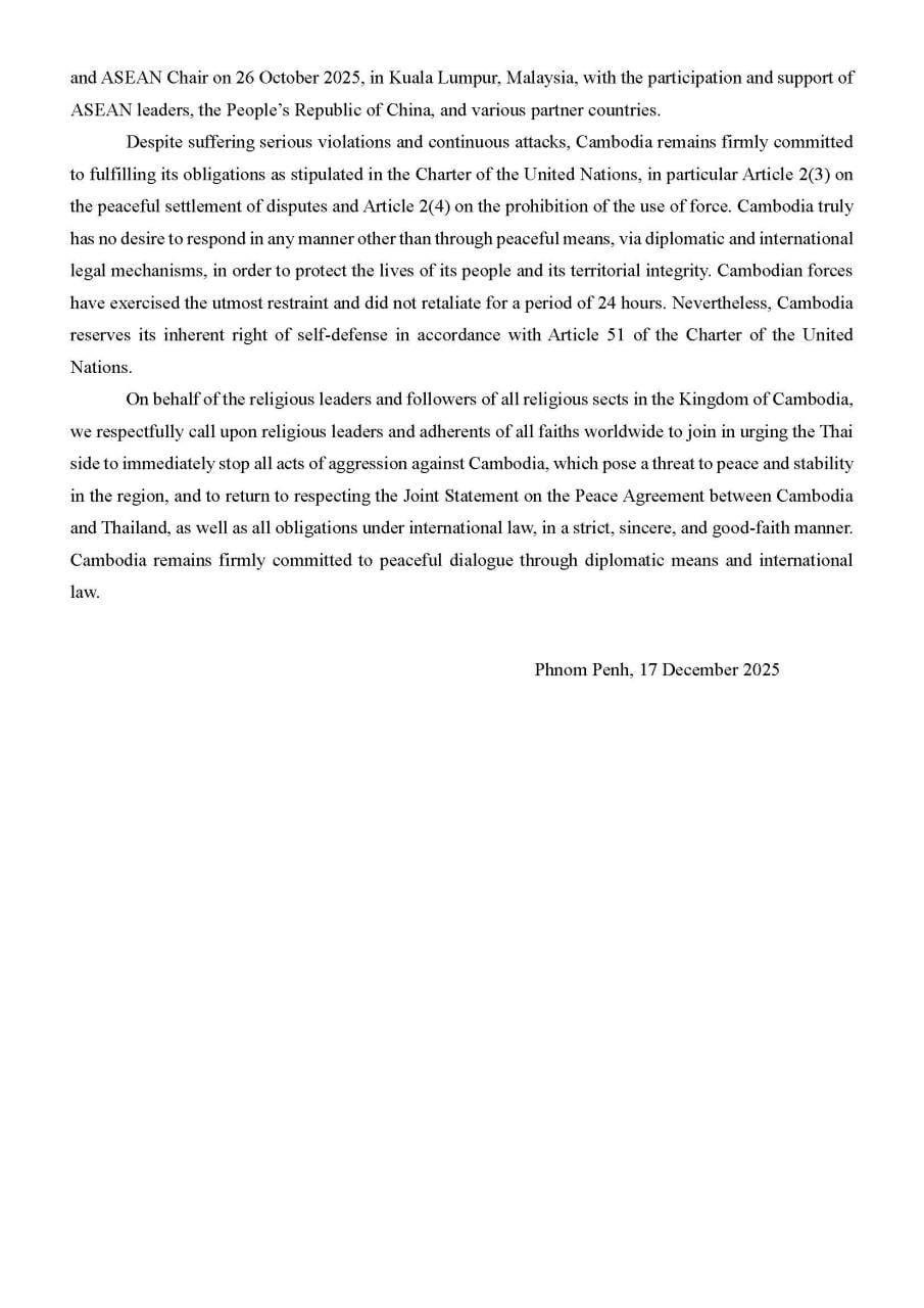 តាងនាមថ្នាក់ដឹកនាំ និងបរិស័ទគ្រប់និកាយសាសនានៅព្រះរាជាណាចក្រកម្ពុជា អាត្មាភាព យើងខ្ញុំសូម ឱ្យថ្នាក់ដឹកនាំ និងសាសនិកគ្រប់និកាយសាសនានៅទូទាំងពិភពលោក ចូលរួមអំពាវនាវឱ្យភាគីថៃបញ្ឈប់រាល់ អំពើឈ្លានពានមកលើកម្ពុជាជាបន្ទាន់ ដែលជាការគំរាមកំហែងដល់សន្តិភាព និងស្ថិរភាពនៅក្នុងតំបន់ ហើយ ងាកមកគោរពសេចក្តីថ្លែងការណ៍រួមស្តីពីកិច្ចព្រមព្រៀងសន្តិភាពរវាងកម្ពុជានិងថៃ និងកាតព្វកិច្ចទាំងឡាយនៅ ក្រោមច្បាប់អន្តរជាតិឱ្យបានម៉ឺងម៉ាត់ ស្មោះត្រង់ និងដោយសុច្ឆន្ទៈពិតប្រាកដ។ កម្ពុជានៅតែប្តេជ្ញាចិត្តយ៉ាង មុតមាំចំពោះការសន្ទនាដោយសន្តិវិធី តាមការទូត និងច្បាប់អន្តរជាតិ៕