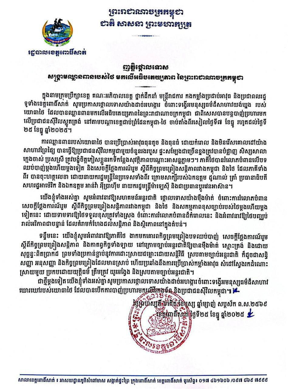 រដ្ឋបាលខេត្តពោធិ៍សាត់ ចេញញត្តិថ្កោលទោស សង្គ្រាមឈ្លានពានរបស់ថៃមកលើអធិបតេយ្យភាព នៃព្រះរាជាណាចក្រកម្ពុជា