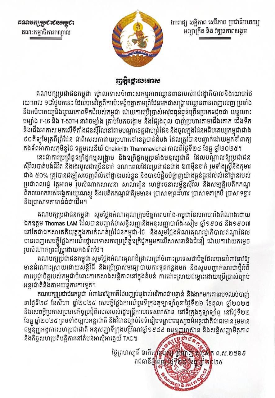 គណបក្សប្រជាជនកម្ពុជា ចេញញត្តិថ្កោលទោស សង្គ្រាមឈ្លានពានរបស់ថៃមកលើអធិបតេយ្យភាព នៃព្រះរាជាណាចក្រកម្ពុជា