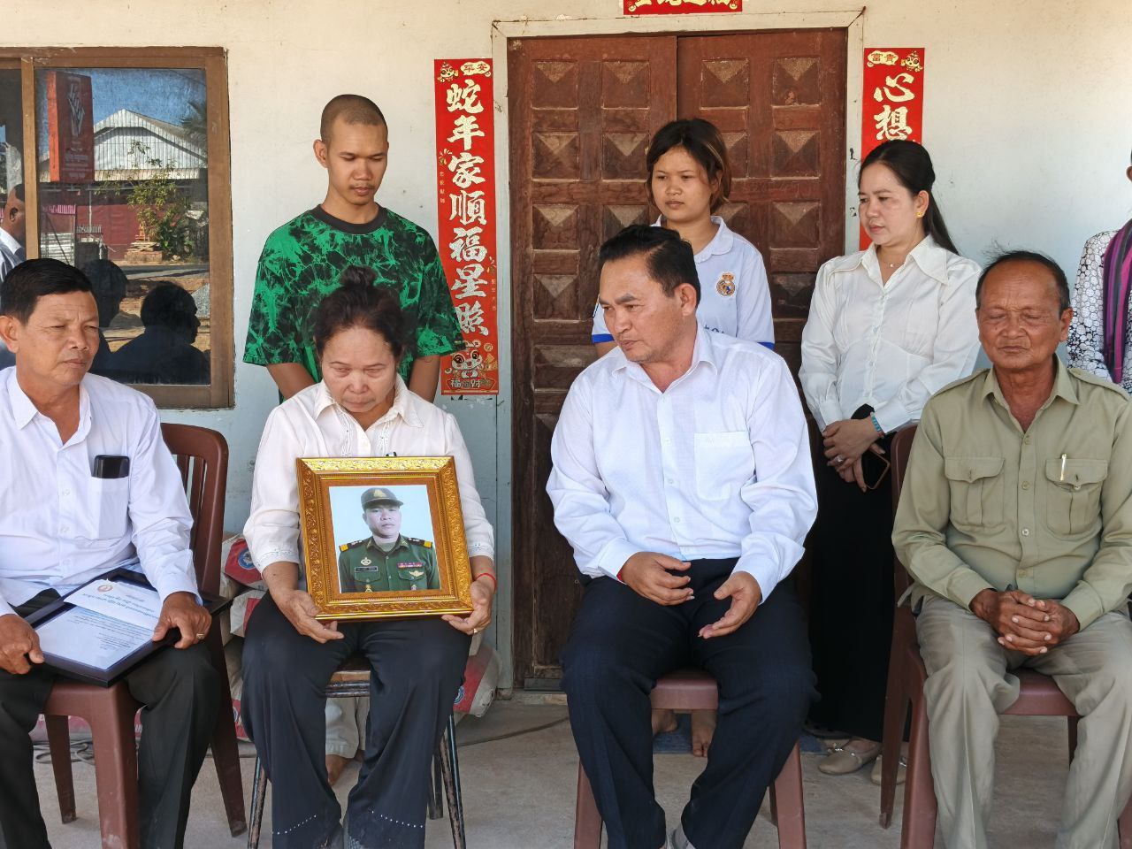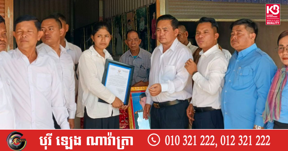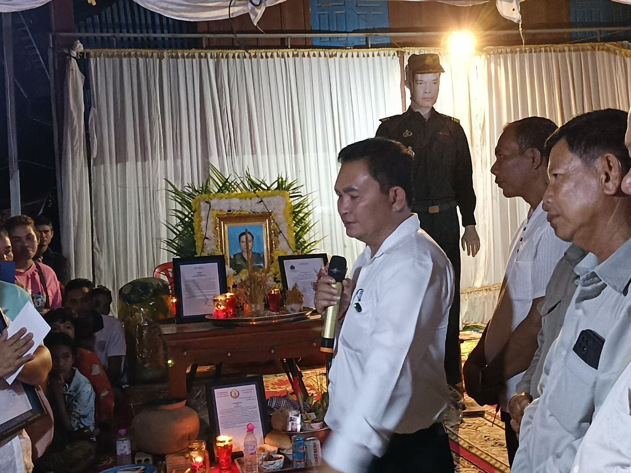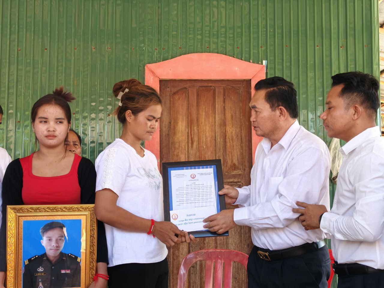 ជួសមុខឲ្យលោក យូ សិរីវុឌ្ឍ និងលោក ភឺន ផល្លា, លោក ហ៊ុន សុខា បានពាំនាំនូវសារលិខិតរំលែកទុក្ខ និងថវិកាជូនដល់គ្រួសារសព ដែលបានពលីជីវិតដើម្បីជាតិមាតុភូមិ ការពារអធិបតេយ្យភាព និងបូរណភាពទឹកដី និងប្រជាជនកម្ពុជា ពីសំណាក់ចោសៀមឈ្លានពានទឹកដីកម្ពុជាយើង ព្រោះគ្រួសាររបស់គាត់បានលះបង់សាច់ស្រស់ឈាមស្រស់ ពលីជីវិតលើសមរភូមិដើម្បីការពារជាតិមាតុភូមិនិងបូរណភាពទឹកដី ។