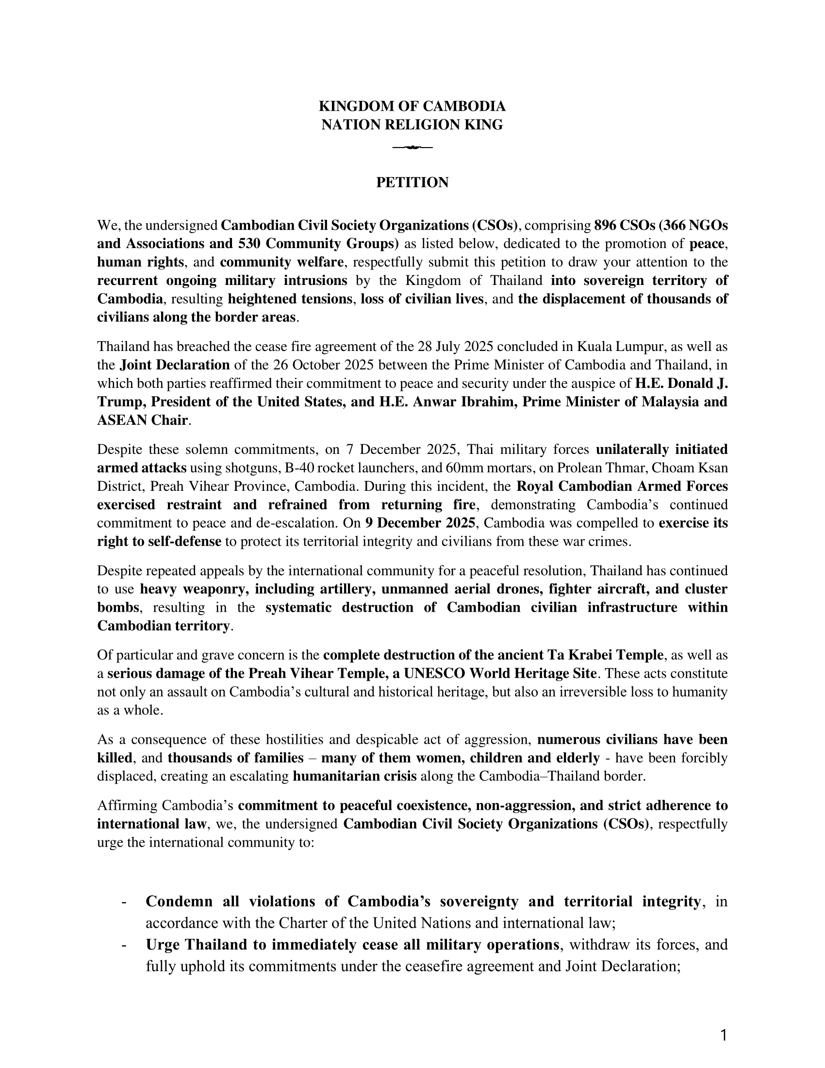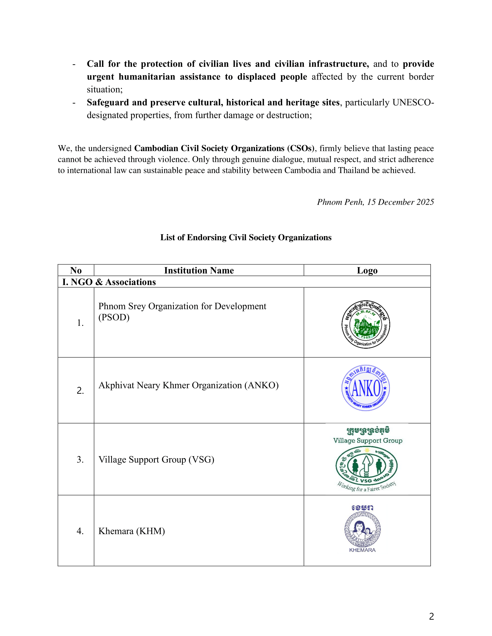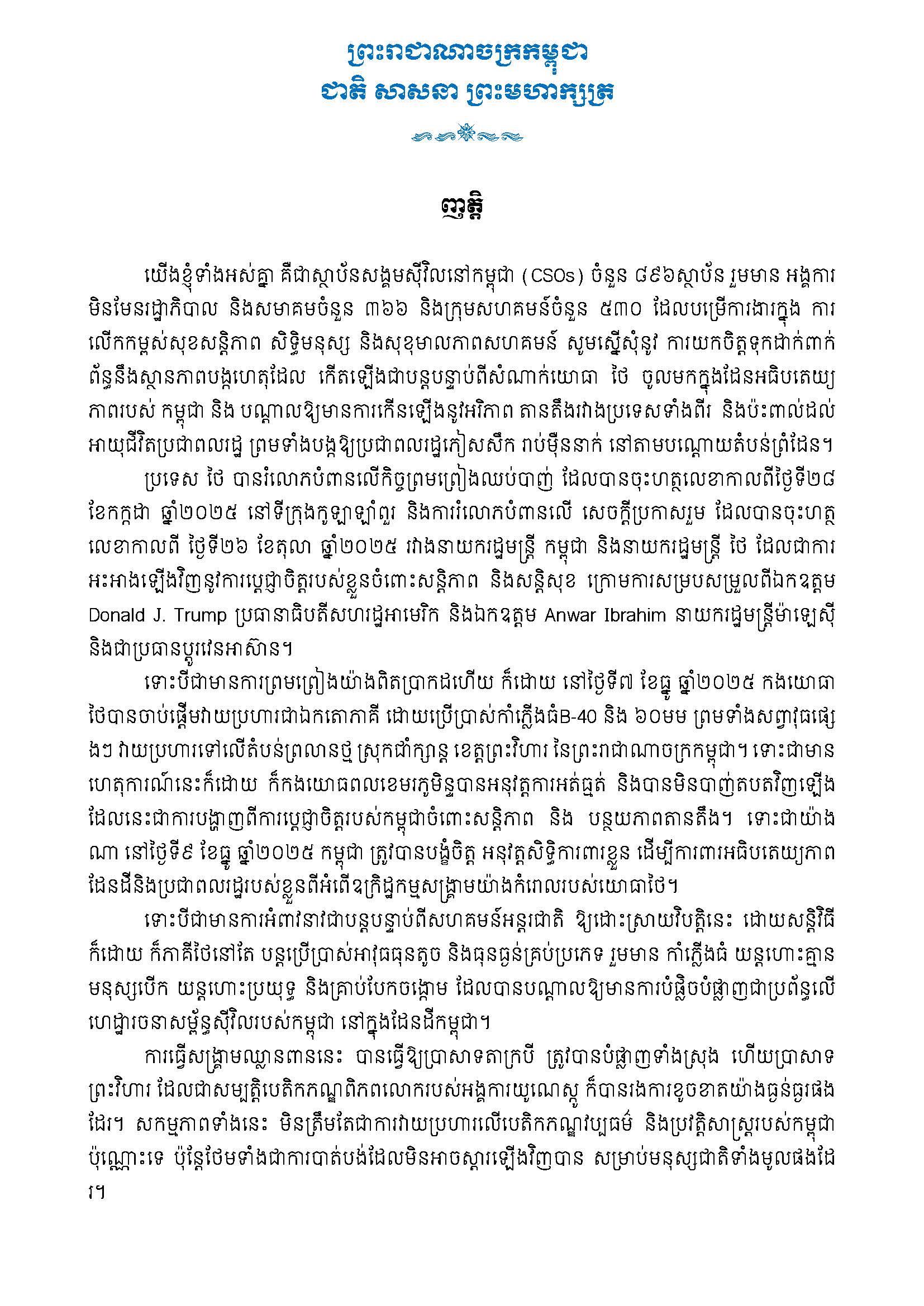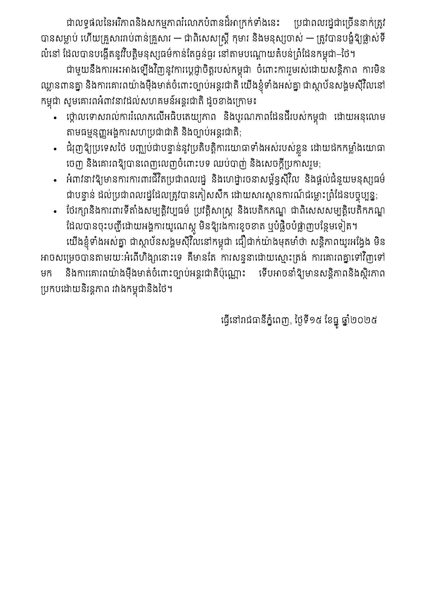 ជាមួយនឹងការអះអាងឡើងវិញនូវការប្តេជ្ញាចិត្តរបស់កម្ពុជា ចំពោះការរួមរស់ដោយសន្ដិភាព ការមិនឈ្លានពានគ្នា និងការគោរពយ៉ាងម៉ឺងមាត់ចំពោះច្បាប់អន្តរជាតិ យើងខ្ញុំទាំងអស់គ្នា ជាស្ថាប័នសង្គមស៊ីវិលនៅកម្ពុជា សូមគោរពអំពាវនាវដល់សហគមន៍អន្តរជាតិ ដូចខាងក្រោម៖
