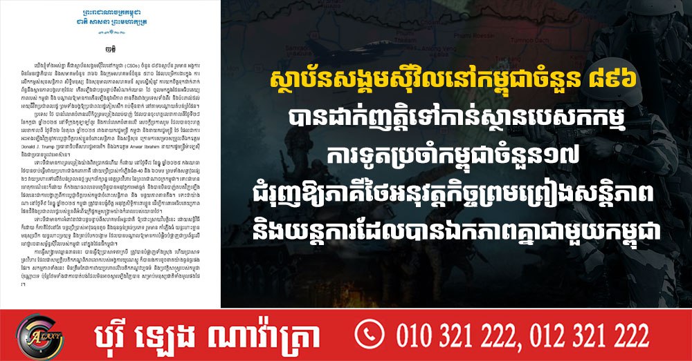ស្ថាប័នសង្គមស៊ីវិលនៅកម្ពុជាចំនួន ៨៩៦ បានដាក់ញត្តិទៅកាន់ស្ថានបេសកកម្មការទូតប្រចាំកម្ពុជាចំនួន១៧ ជំរុញឱ្យភាគីថៃអនុវត្តកិច្ចព្រមព្រៀងសន្តិភាព និងយន្តការដែលបានឯកភាពគ្នាជាមួយកម្ពុជា