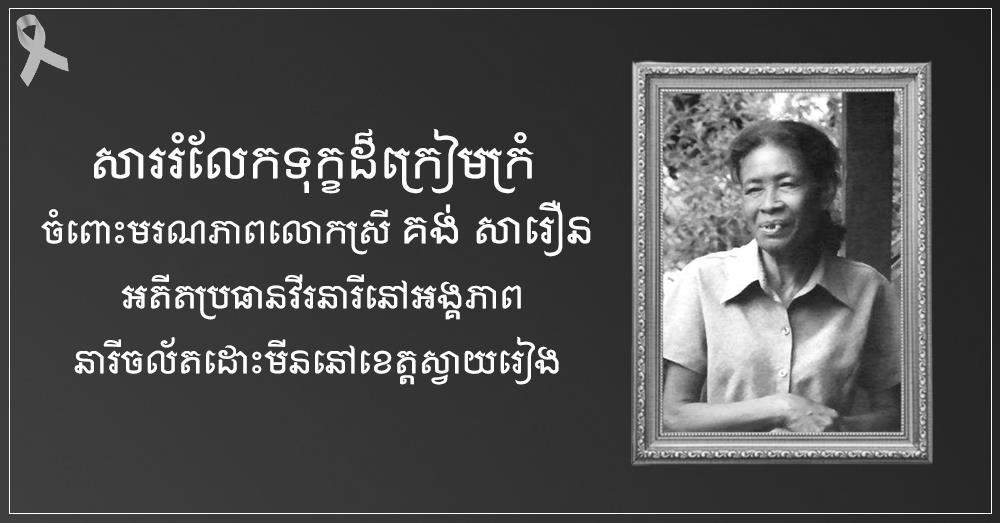 អភិបាលខេត្តស្វាយរៀង ផ្ញើសាររំលែកមរណទុក្ខ ចំពោះមរណភាពលោកស្រី គង់ សារឿន អតីតប្រធានវីរនារីនៅអង្គភាពនារីចល័តដោះមីននៅខេត្តស្វាយរៀង