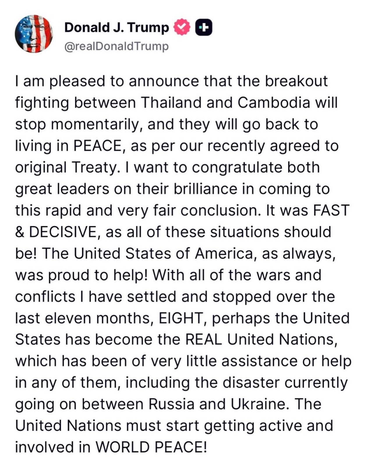 (វ៉ាស៊ីនតោន)៖ ប្រធានាធិបតីអាមេរិក លោក ដូណាល់ ត្រាំ បានប្រកាសនៅលើបណ្តាញសង្គមរបស់លោកថា ការប្រយុទ្ធគ្នារវាងថៃ និងកម្ពុជា បានបិទបញ្ចប់ ហើយប្រទេសទាំងពីរនឹងត្រឡប់ទៅរកសន្តិភាពវិញ ដោយអនុលោមតាមសន្ធិសញ្ញាដើមដែលបានព្រមព្រៀងគ្នាកាលពីពេលថ្មីៗនេះ។