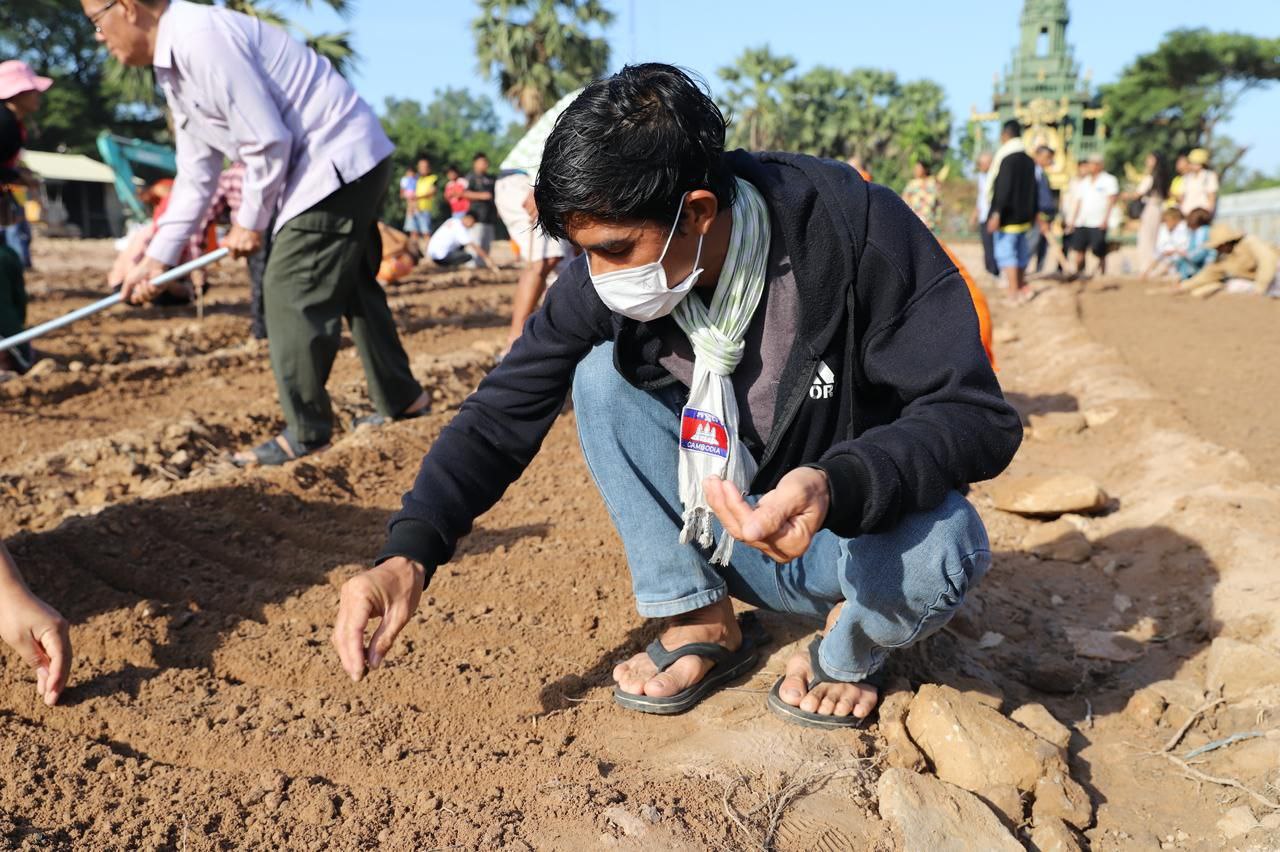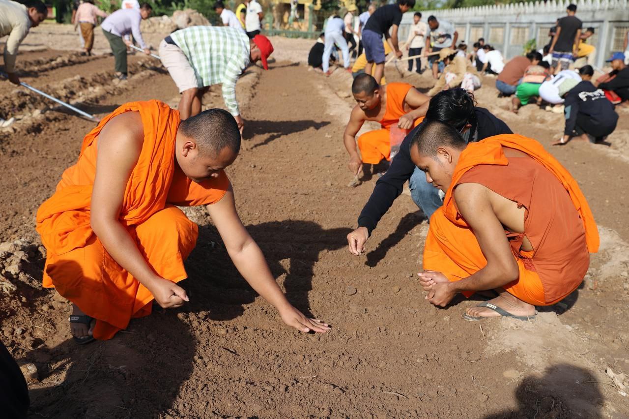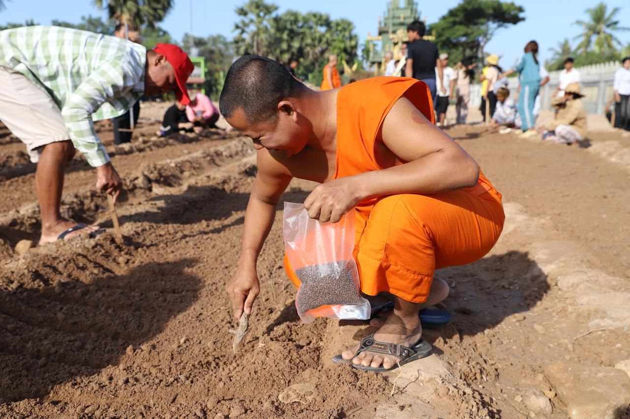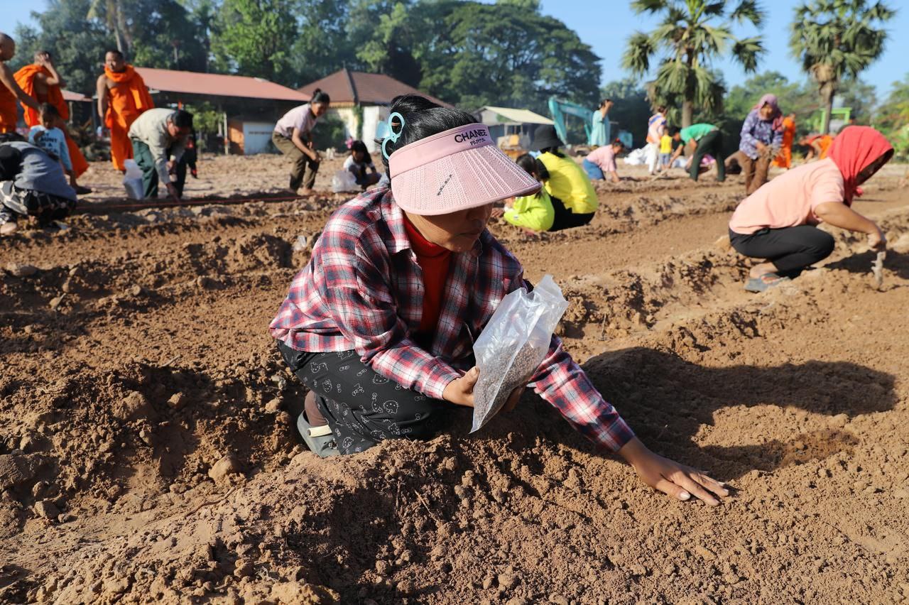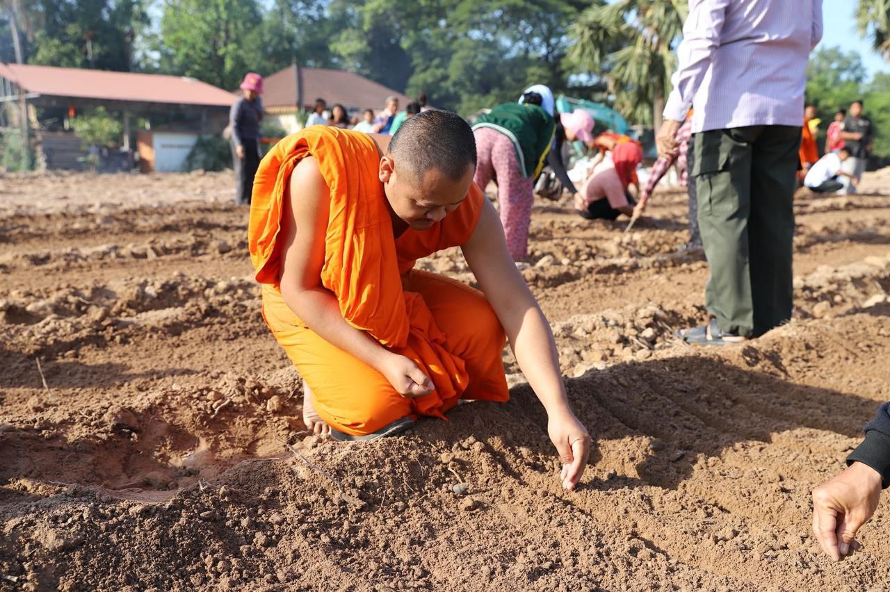 (សៀមរាប)៖ ព្រះគ្រូវិចិត្រវង្សា ហែម គឹមសាន ចៅអធិការវត្តប្រាសាទគោកចក ក្នុងក្រុងសៀមរាប និងអាជ្ញាធរមូលដ្ឋាន ព្រមទាំងមន្ត្រីជំនាញ នៅថ្ងៃទី២៩ ខែធ្នូ ឆ្នាំ២០២៥ បានដឹកនាំបងប្អូនជនភៀសសឹកដែលកំពុងតែស្នាក់នៅក្នុងវត្ត ជួយគ្នាដាំដំណាំបន្លែដើម្បីជាស្បៀងអាហារ និងផ្គត់ផ្គង់ដល់ការហូបចុក និងសម្រួលជីវភាពប្រចាំថ្ងៃ ក្នុងពេលដែលពួកគាត់រស់នៅបណ្ដោះអាសន្នក្នុងវត្ត។