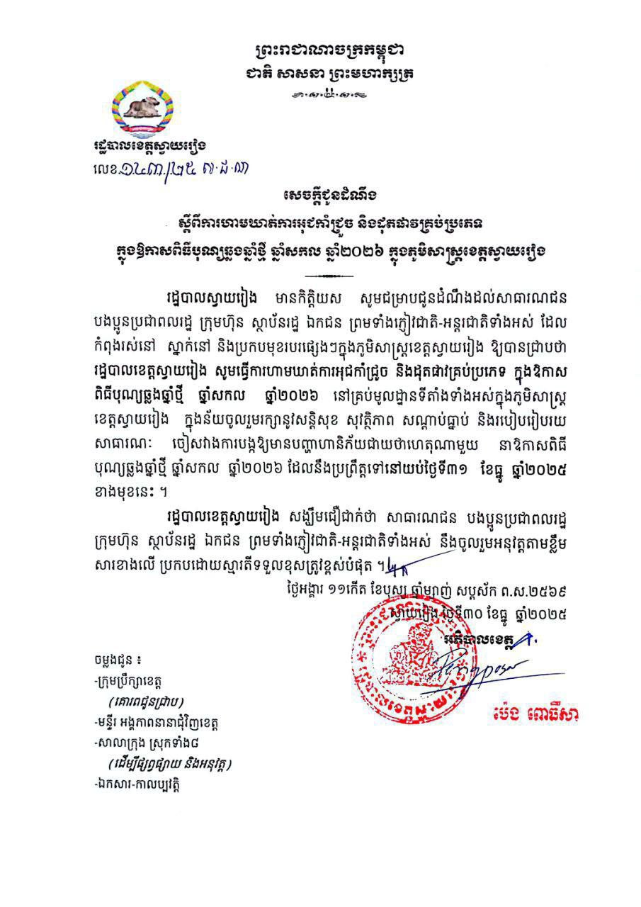 (ស្វាយរៀង)៖ រដ្ឋបាលខេត្តស្វាយរៀង សូមធ្វើការហាមឃាត់ការអុជកាំជ្រួច និងដុតផាវគ្រប់ប្រភេទ ក្នុងឱកាសពិធីបុណ្យឆ្លងឆ្នាំថ្មី ឆ្នាំសកល ឆ្នាំ២០២៦ នៅគ្រប់មូលដ្ឋានទីតាំង ទាំងអស់ក្នុងភូមិសាស្ត្រ ខេត្តស្វាយរៀង ក្នុងន័យចូលរួមរក្សានូវសន្តិសុខ សុវត្ថិភាព សណ្តាប់ធ្នាប់ និងរបៀបរៀបរយ សាធារណៈ ចៀសវាងការបង្កឱ្យមានបញ្ហាហានិភ័យ ជាយថាហេតុណាមួយ នាឱកាសពិធី បុណ្យឆ្លងឆ្នាំថ្មី ឆ្នាំសកល ឆ្នាំ២០២៦ ដែលនឹងប្រព្រឹត្តទៅនៅយប់ថ្ងៃទី៣១ ខែធ្នូ ឆ្នាំ២០២៥ ខាងមុខនេះ ។