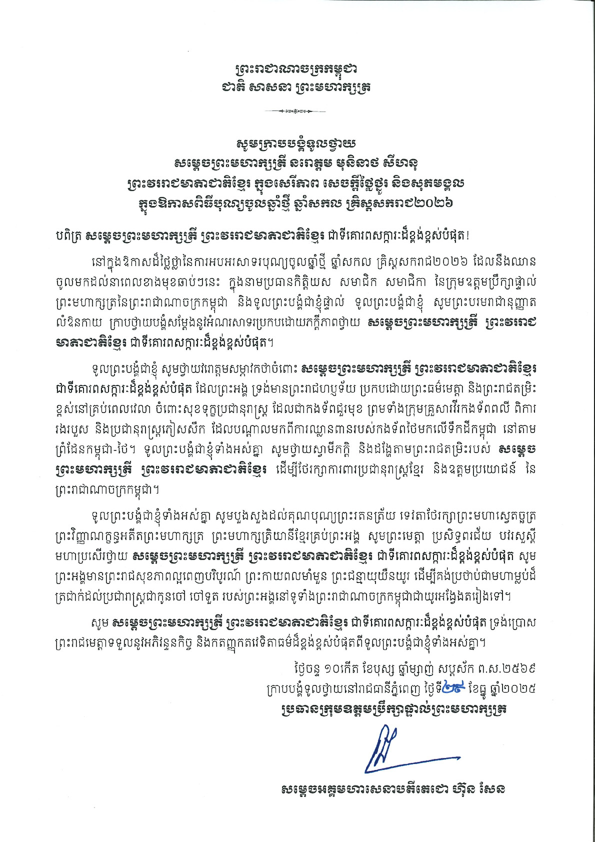 ប្រធានក្រុមឧត្តមប្រឹក្សាផ្ទាល់ព្រះមហាក្សត្រ សូមក្រាបបង្គំទូលថ្វាយព្រះពរ ព្រះមហាក្សត្រនៃព្រះរាជាណាចក្រកម្ពុជា ក្នុងឱកាសពិធីបុណ្យចូលឆ្នាំថ្មី ឆ្នាំសកល គ្រិស្តសករាជ២០២៦
