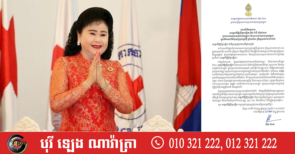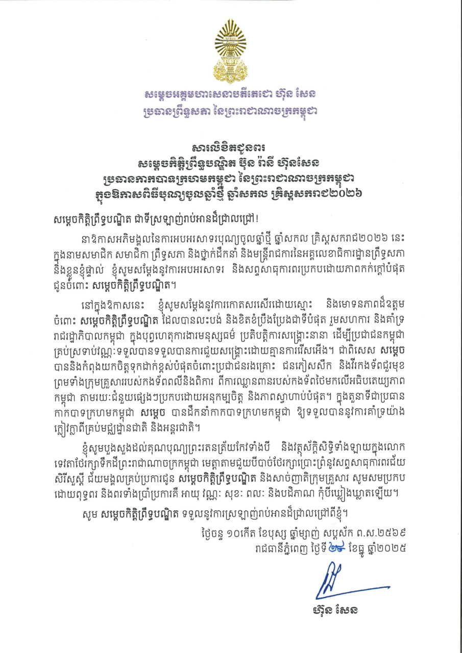 (ភ្នំពេញ)៖ សម្តេចអគ្គមហាសេនាបតីតេជោ ហ៊ុន សែន ប្រធានព្រឹទ្ធសភា នៃព្រះរាជាណាចក្រកម្ពុជា បានផ្ញើសារលិខិតជូនពរ សម្ដេចកិត្ដិព្រឹទ្ធបណ្ឌិត ប៊ុន រានី ហ៊ុនសែន ប្រធានកាកបាទប្រហមកម្ពុជា នៃព្រះរាជាណាចក្រកម្ពុជា ក្នុងឱកាសពិធីបុណ្យចូលឆ្នាំថ្មី ឆ្នាំសកល គ្រិស្តសករាជ ២០២៦។