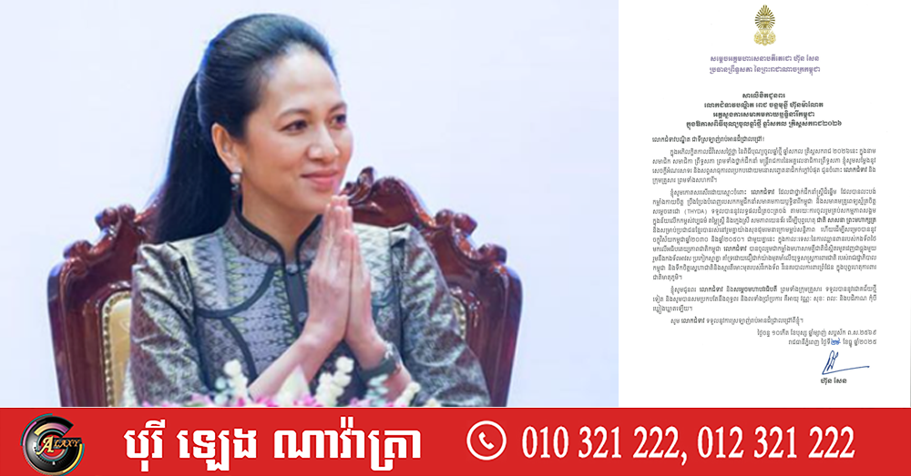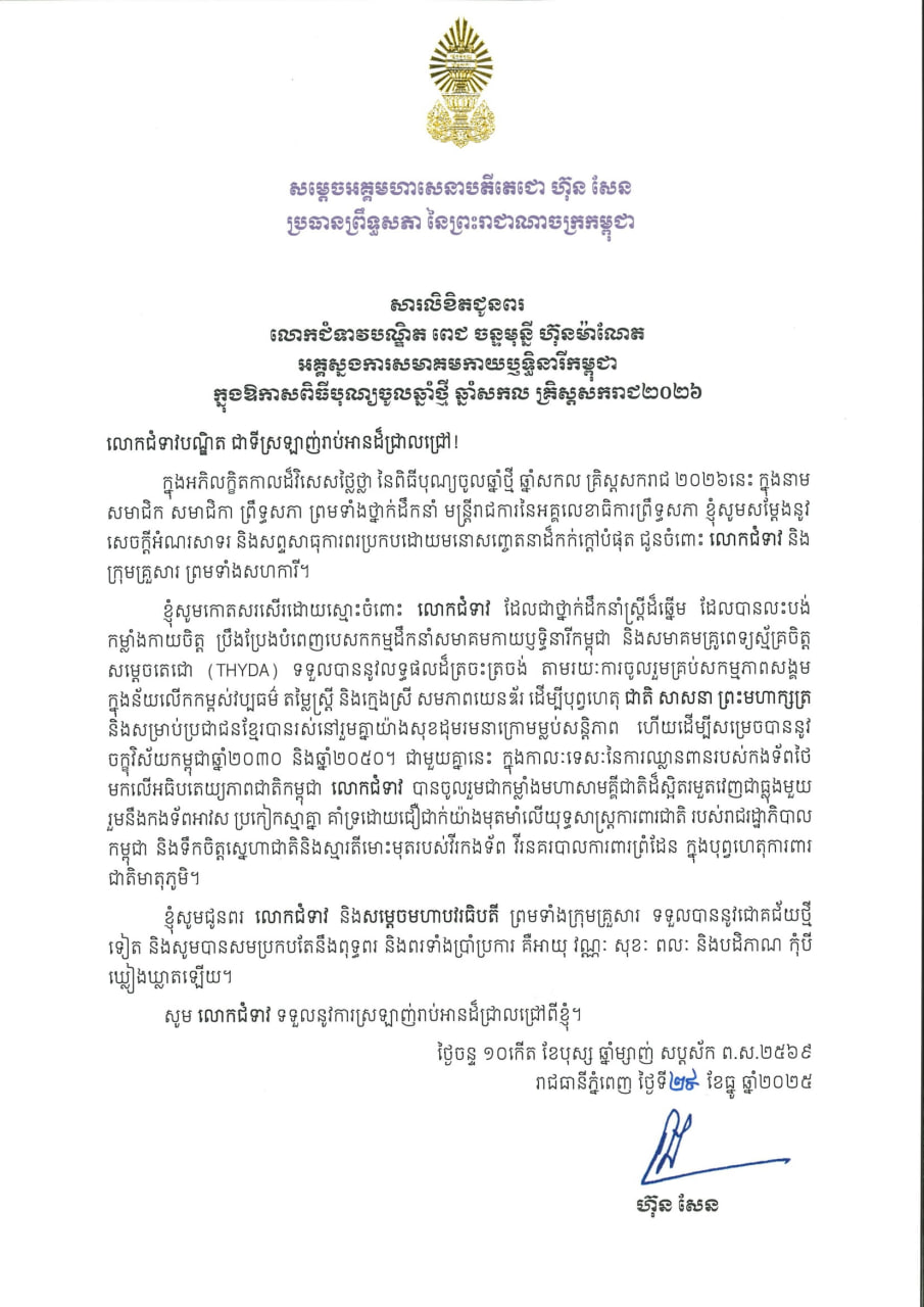 (ភ្នំពេញ)៖ សម្តេចអគ្គមហាសេនាបតីតេជោ ហ៊ុន សែន ប្រធានព្រឹទ្ធសភា នៃព្រះរាជាណាចក្រកម្ពុជា បានផ្ញើសារលិខិតជូនពរ លោកជំទាវបណ្ឌិត ពេជ ចន្ទមុន្នី ហ៊ុនម៉ាណែត អគ្គស្នងការសមាគមកាយឬទ្ធិនារីកម្ពុជា ក្នុងឱកាសពិធីបុណ្យចូលឆ្នាំថ្មី ឆ្នាំសកល គ្រិស្តសករាជ ២០២៦។