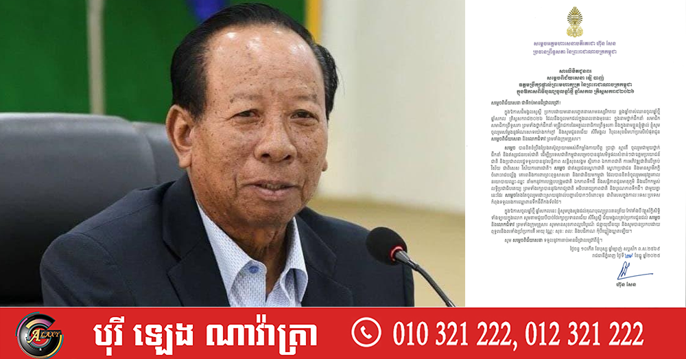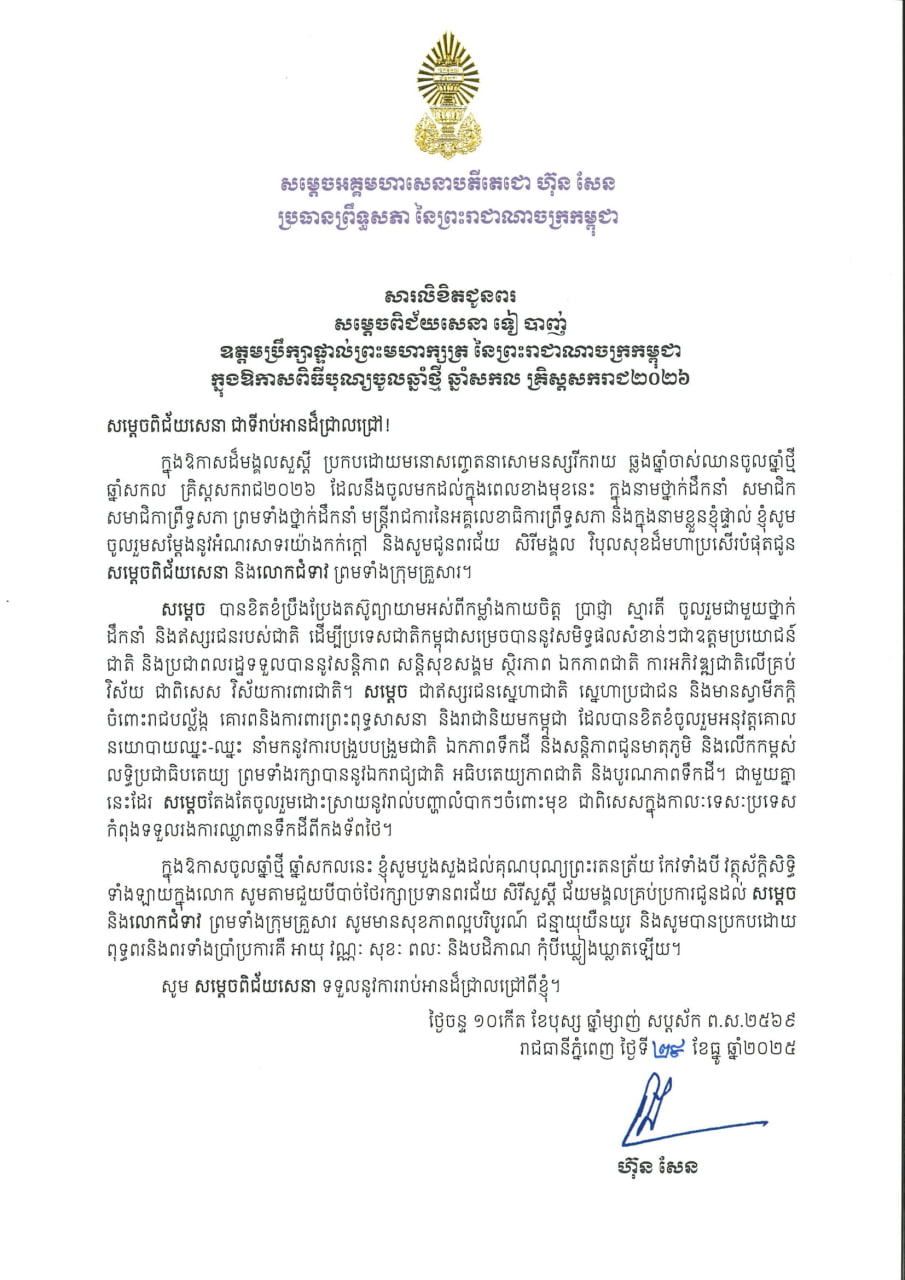 (ភ្នំពេញ)៖ សម្តេចអគ្គមហាសេនាបតីតេជោ ហ៊ុន សែន ប្រធានព្រឹទ្ធសភា នៃព្រះរាជាណាចក្រកម្ពុជា បានផ្ញើសារលិខិតជូនពរ សម្ដេចពិជ័យសេនា ទៀ បាញ់ ឧត្ដមប្រឹក្សាផ្ទាល់ព្រះមហាក្សត្រ នៃព្រះរាជាណាចក្រកម្ពុជា ក្នុងឱកាសពិធីបុណ្យចូលឆ្នាំថ្មី ឆ្នាំសកល គ្រិស្តសករាជ ២០២៦។