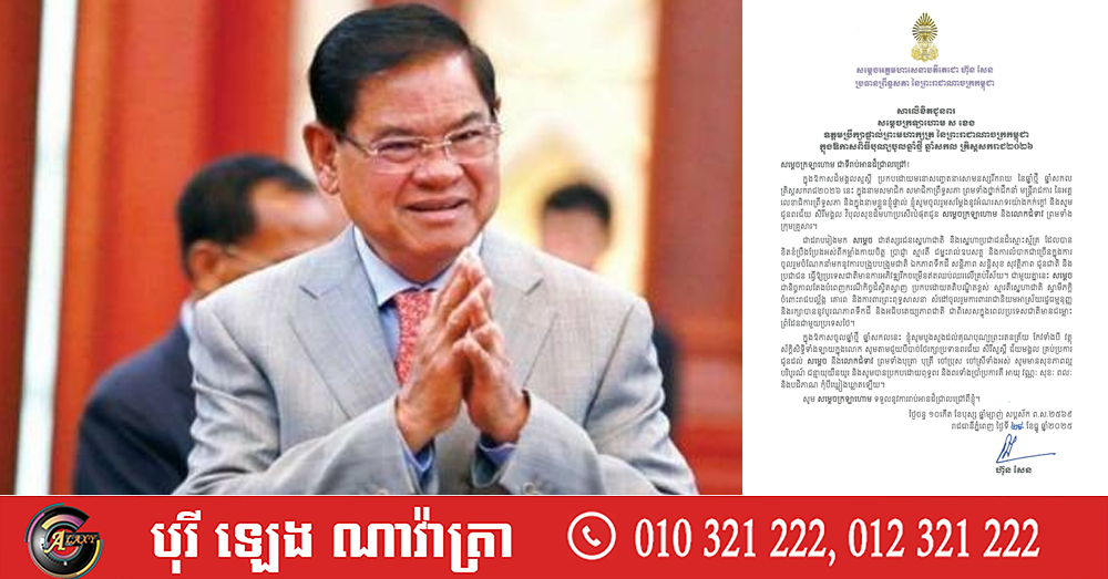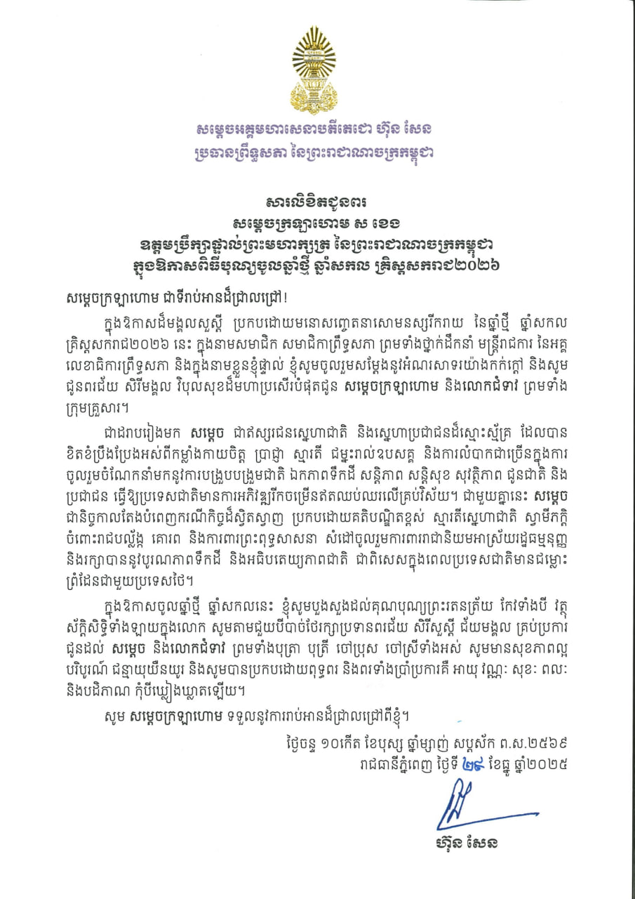 (ភ្នំពេញ)៖ សម្តេចអគ្គមហាសេនាបតីតេជោ ហ៊ុន សែន ប្រធានព្រឹទ្ធសភា នៃព្រះរាជាណាចក្រកម្ពុជា បានផ្ញើសារលិខិតជូនពរ សម្ដេចក្រឡាហោម ស ខេង ឧត្ដមប្រឹក្សាផ្ទាល់ព្រះមហាក្សត្រ នៃព្រះរាជាណាចក្រកម្ពុជា ក្នុងឱកាសពិធីបុណ្យចូលឆ្នាំថ្មី ឆ្នាំសកល គ្រិស្តសករាជ ២០២៦។