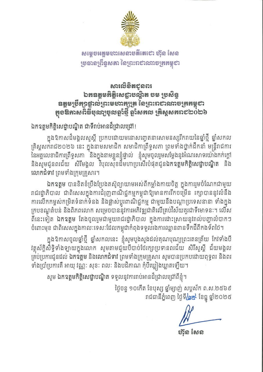 (ភ្នំពេញ)៖ សម្តេចអគ្គមហាសេនាបតីតេជោ ហ៊ុន សែន ប្រធានព្រឹទ្ធសភា នៃព្រះរាជាណាចក្រកម្ពុជា បានផ្ញើសារលិខិតជូនពរ ឯកឧត្ដមកិត្ដិសេដ្ឋាបណ្ឌិត ចម ប្រសិទ្ធ ឧត្ដមប្រឹក្សាផ្ទាល់ព្រះមហាក្សត្រ នៃព្រះរាជាណាចក្រកម្ពុជា ក្នុងឱកាសពិធីបុណ្យចូលឆ្នាំថ្មី ឆ្នាំសកល គ្រិស្តសករាជ ២០២៦។