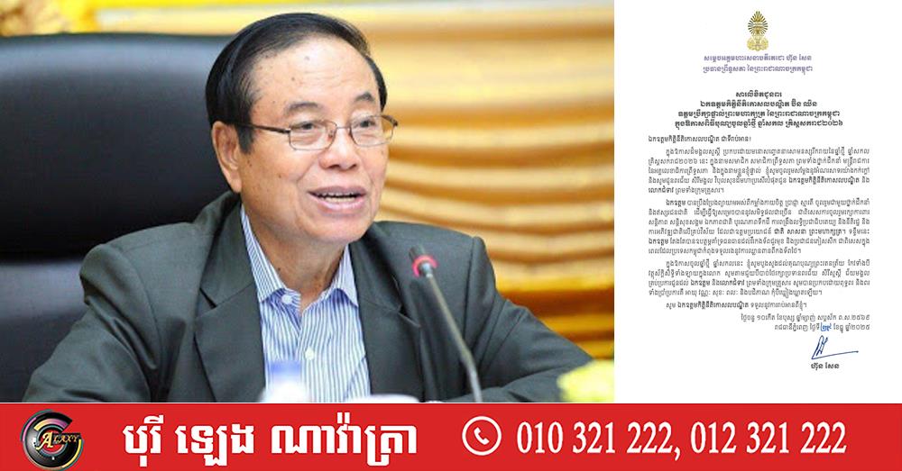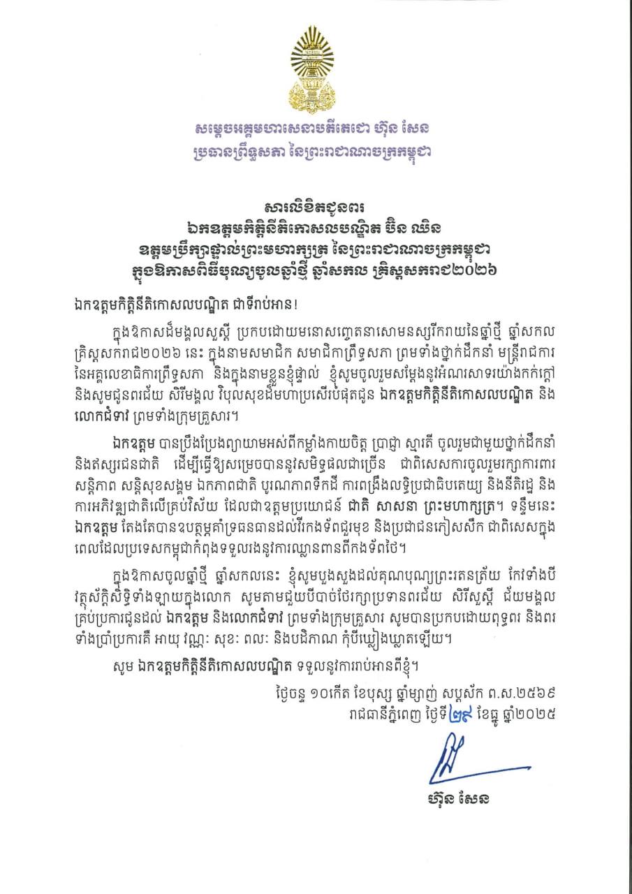 (ភ្នំពេញ)៖ សម្តេចអគ្គមហាសេនាបតីតេជោ ហ៊ុន សែន ប្រធានព្រឹទ្ធសភា នៃព្រះរាជាណាចក្រកម្ពុជា បានផ្ញើសារលិខិតជូនពរ ឯកឧត្ដមកិត្ដិនីតិកោសលបណ្ឌិត ប៊ិន ឈិន ឧត្ដមប្រឹក្សាផ្ទាល់ព្រះមហាក្សត្រ នៃព្រះរាជាណាចក្រកម្ពុជា ក្នុងឱកាសពិធីបុណ្យចូលឆ្នាំថ្មី ឆ្នាំសកល គ្រិស្តសករាជ ២០២៦។