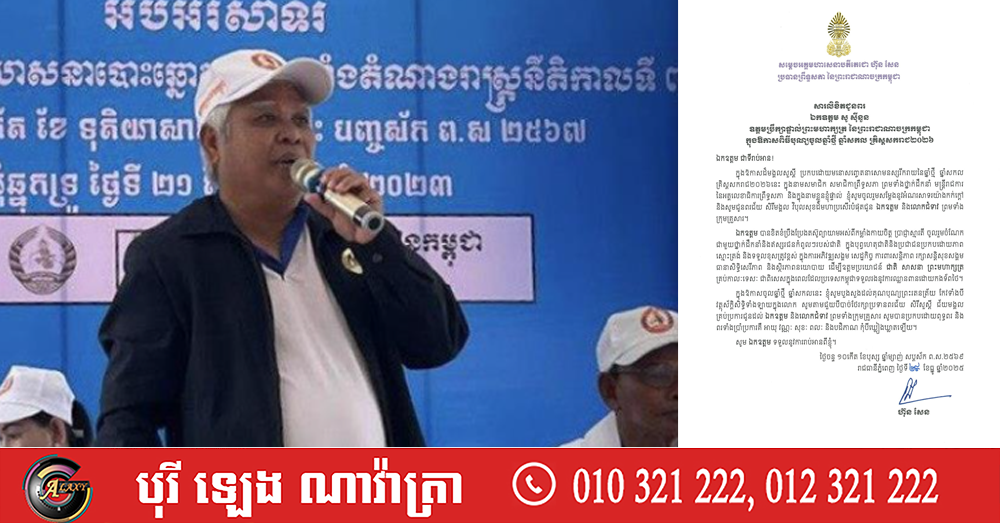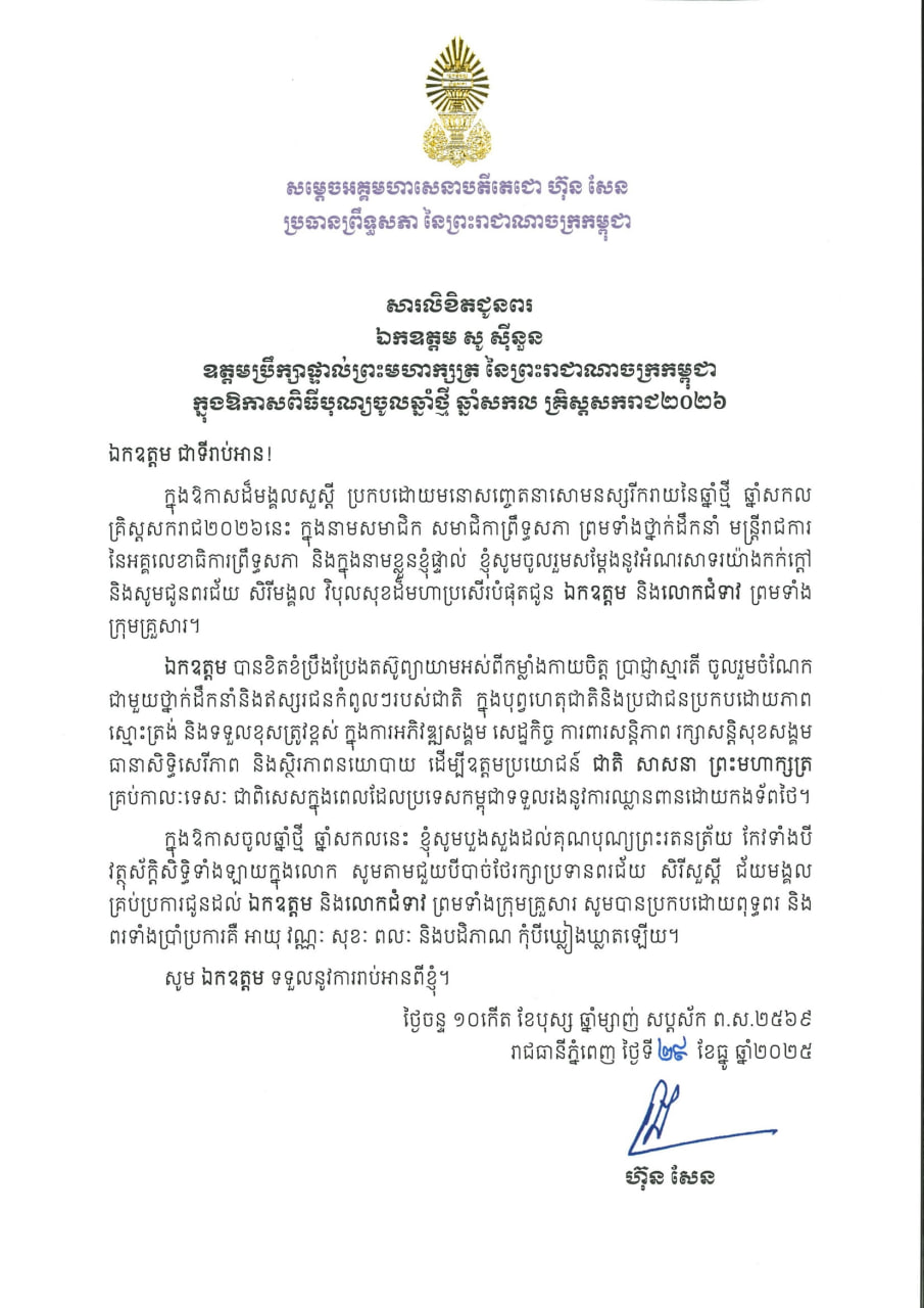 (ភ្នំពេញ)៖ សម្តេចអគ្គមហាសេនាបតីតេជោ ហ៊ុន សែន ប្រធានព្រឹទ្ធសភា នៃព្រះរាជាណាចក្រកម្ពុជា បានផ្ញើសារលិខិតជូនពរ ឯកឧត្ដម សូ ស៊ីនួន ឧត្ដមប្រឹក្សាផ្ទាល់ព្រះមហាក្សត្រ នៃព្រះរាជាណាចក្រកម្ពុជា ក្នុងឱកាសពិធីបុណ្យចូលឆ្នាំថ្មី ឆ្នាំសកល គ្រិស្តសករាជ ២០២៦។
