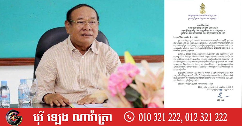 (ភ្នំពេញ)៖ សម្តេចអគ្គមហាសេនាបតីតេជោ ហ៊ុន សែន ប្រធានព្រឹទ្ធសភា នៃព្រះរាជាណាចក្រកម្ពុជា បានផ្ញើសារលិខិតជូនពរ ឯកឧត្ដមកិត្ដិឧទ្ទេសបណ្ឌិត ប៉ុល សារឿន ឧត្ដមប្រឹក្សាផ្ទាល់ព្រះមហាក្សត្រ នៃព្រះរាជាណាចក្រកម្ពុជា ក្នុងឱកាសពិធីបុណ្យចូលឆ្នាំថ្មី ឆ្នាំសកល គ្រិស្តសករាជ ២០២៦។