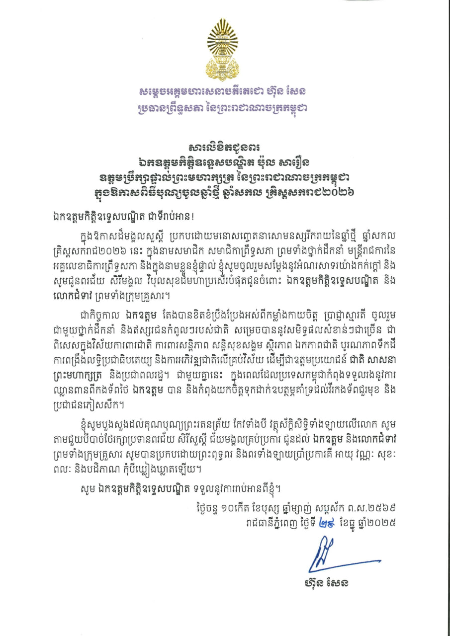 ក្នុងឱកាសដ៏មង្គលសួស្តី ប្រកបដោយមនោសញ្ចេតនាសោមនស្សរីករាយ នៃឆ្នាំថ្មី ឆ្នាំសកល គ្រិស្តសករាជ២០២៦នេះ ក្នុងនាមសមាជិក សមាជិកាព្រឹទ្ធសភា ព្រមទាំងថ្នាក់ដឹកនាំ មន្ត្រីរាជការនៃ អគ្គលេខាធិការព្រឹទ្ធសភា និងក្នុងនាមខ្លួនខ្ញុំផ្ទាល់ ខ្ញុំសូមចូលរួមសម្តែងនូវអំណរសាទរយ៉ាងកក់ក្តៅ និងសូមជូនពរជ័យ សិរីមង្គលវិបុលសុខដ៏មហាប្រសើរបំផុត។