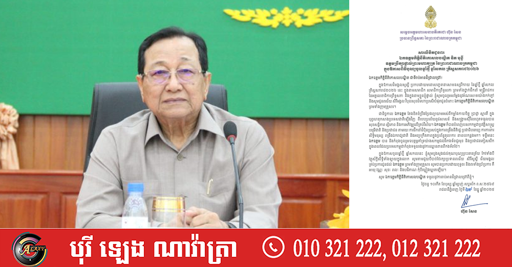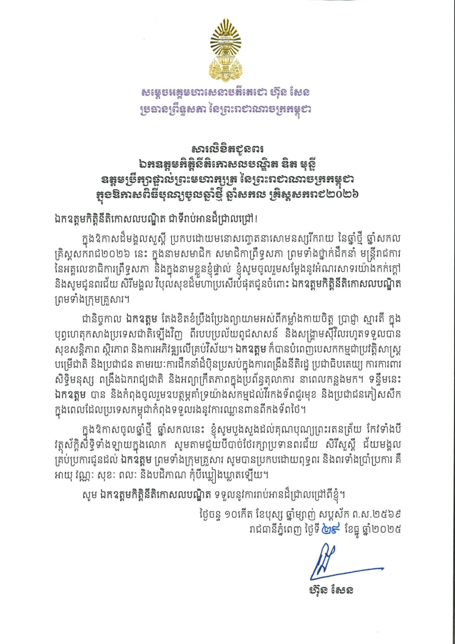 (ភ្នំពេញ)៖ សម្តេចអគ្គមហាសេនាបតីតេជោ ហ៊ុន សែន ប្រធានព្រឹទ្ធសភា នៃព្រះរាជាណាចក្រកម្ពុជា បានផ្ញើសារលិខិតជូនពរ ឯកឧត្ដមកិត្ដិនីតិកោសលបណ្ឌិត ឌិត មុន្នី ឧត្ដមប្រឹក្សាផ្ទាល់ព្រះមហាក្សត្រ នៃព្រះរាជាណាចក្រកម្ពុជា ក្នុងឱកាសពិធីបុណ្យចូលឆ្នាំថ្មី ឆ្នាំសកល គ្រិស្តសករាជ ២០២៦។
