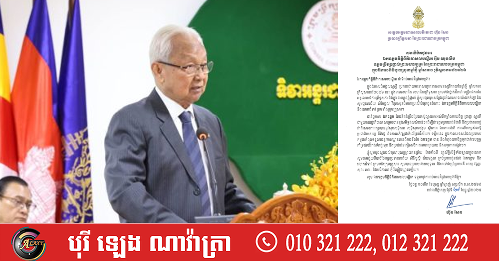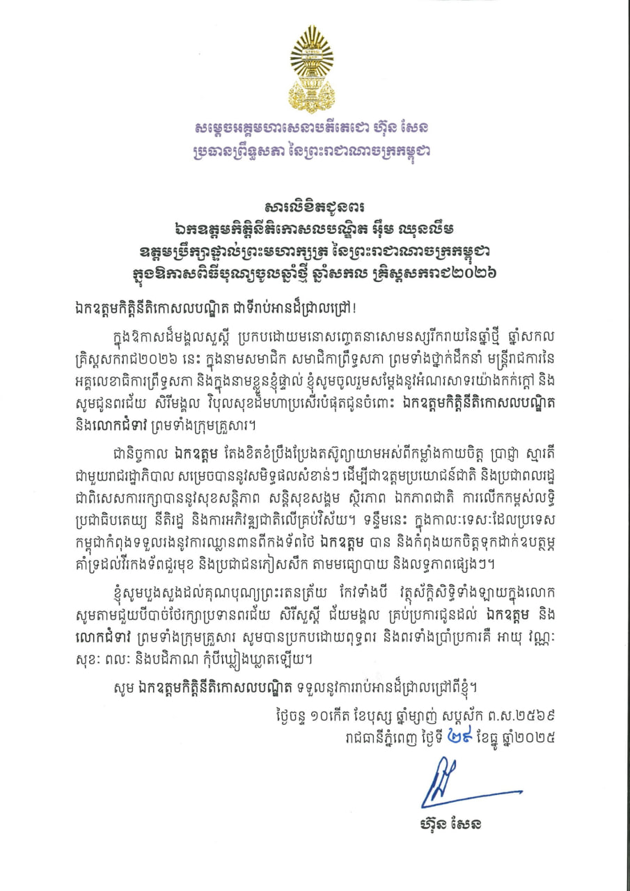 សម្តេចតេជោ ហ៊ុន សែន ផ្ញើសារជូនពរ ឯកឧត្ដមកិត្ដិនីតិកោសលបណ្ឌិត អ៊ឹម ឈុនលឹម ក្នុងឱកាសពិធីបុណ្យចូលឆ្នាំថ្មី ឆ្នាំសកល គ្រិស្តសករាជ ២០២៦