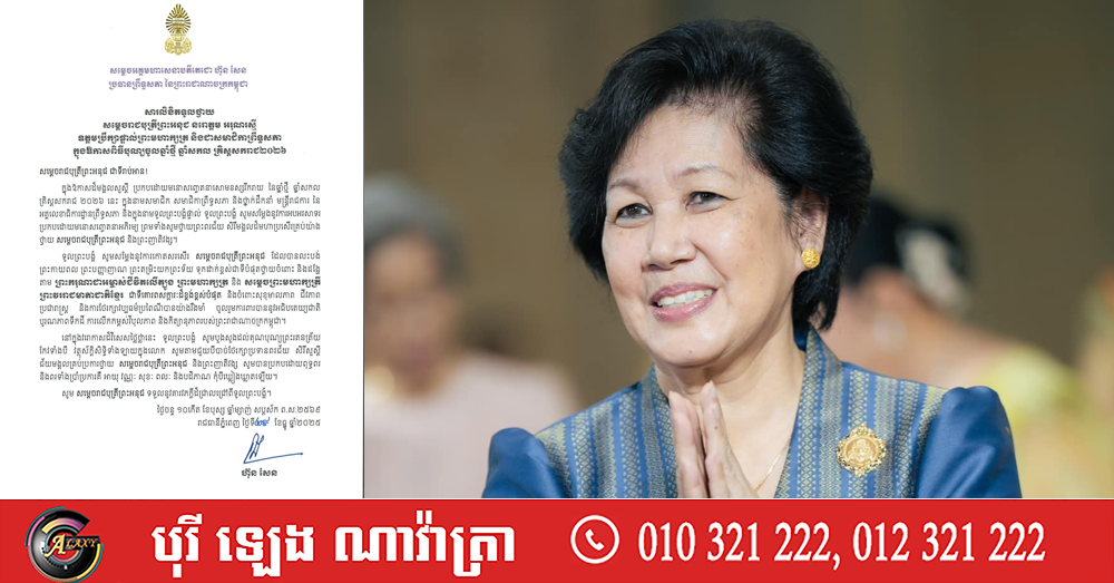 (ភ្នំពេញ)៖ សម្តេចអគ្គមហាសេនាបតីតេជោ ហ៊ុន សែន ប្រធានព្រឹទ្ធសភា នៃព្រះរាជាណាចក្រកម្ពុជា បានផ្ញើសារលិខិតទូលថ្វាយ សម្ដេចរាជបុត្រីព្រះអនុជ នរោត្ដម អរុណរស្មី ឧត្ដមប្រឹក្សាផ្ទាល់ព្រះមហាក្សត្រ នៃព្រះរាជាណាចក្រកម្ពុជា ក្នុងឱកាសពិធីបុណ្យចូលឆ្នាំថ្មី ឆ្នាំសកល គ្រិស្តសករាជ ២០២៦។