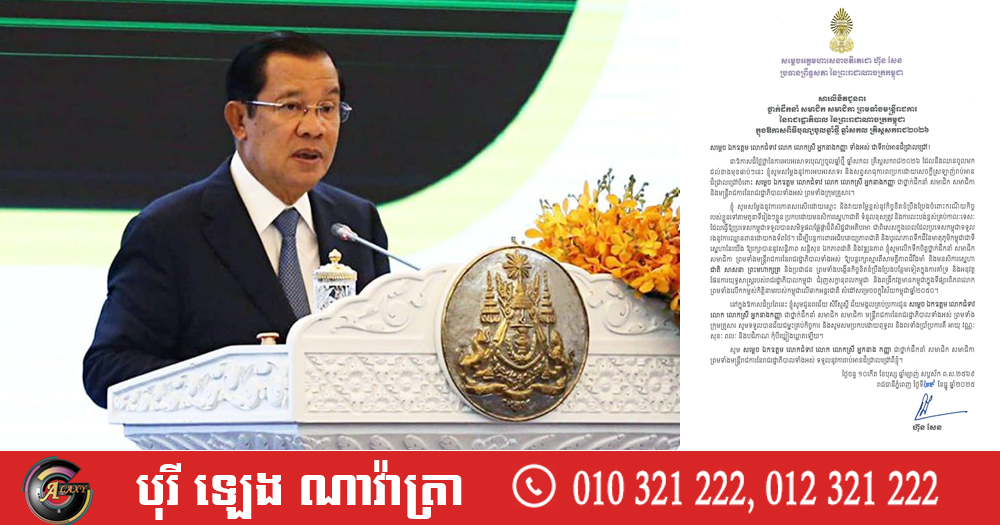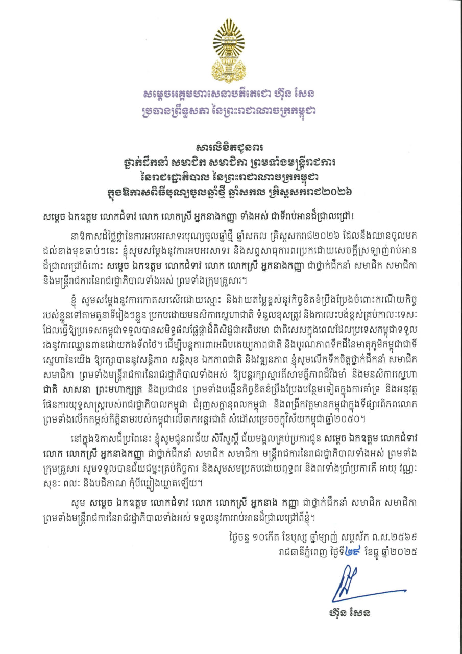 (ភ្នំពេញ)៖ សម្តេចអគ្គមហាសេនាបតីតេជោ ហ៊ុន សែន ប្រធានព្រឹទ្ធសភា នៃព្រះរាជាណាចក្រកម្ពុជា បានចេញសារលិខិតជូនពរ ថ្នាក់ដឹកនាំ សមាជិក សមាជិកា ព្រមទាំងមន្ដ្រីរាជការ នៃរាជរដ្ឋាភិបាល នៃព្រះរាជាណាចក្រកម្ពុជា ក្នុងឱកាសពិធីបុណ្យចូលឆ្នាំថ្មី ឆ្នាំសកល គ្រិស្តសករាជ ២០២៦។