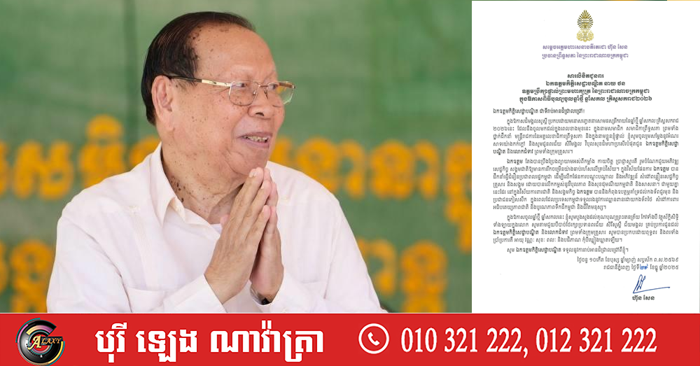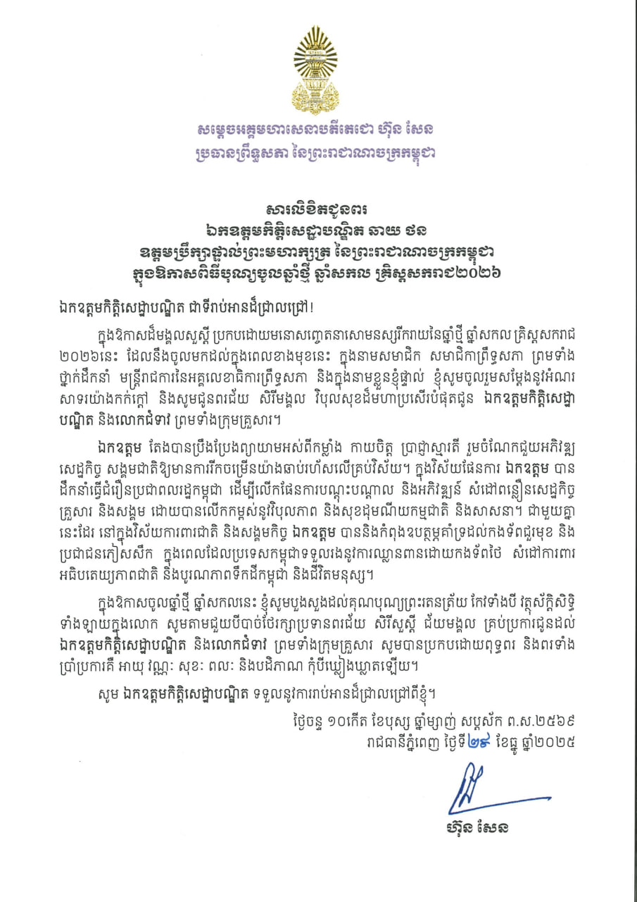 ក្នុងឱកាសដ៏មង្គលសួស្តី ប្រកបដោយមនោសញ្ចេតនាសោមនស្សរីករាយ នៃឆ្នាំថ្មី ឆ្នាំសកល គ្រិស្តសករាជ២០២៦នេះ ក្នុងនាមសមាជិក សមាជិកាព្រឹទ្ធសភា ព្រមទាំងថ្នាក់ដឹកនាំ មន្ត្រីរាជការនៃ អគ្គលេខាធិការព្រឹទ្ធសភា និងក្នុងនាមខ្លួនខ្ញុំផ្ទាល់ ខ្ញុំសូមចូលរួមសម្តែងនូវអំណរសាទរយ៉ាងកក់ក្តៅ និងសូមជូនពរជ័យ សិរីមង្គលវិបុលសុខដ៏មហាប្រសើរបំផុត។