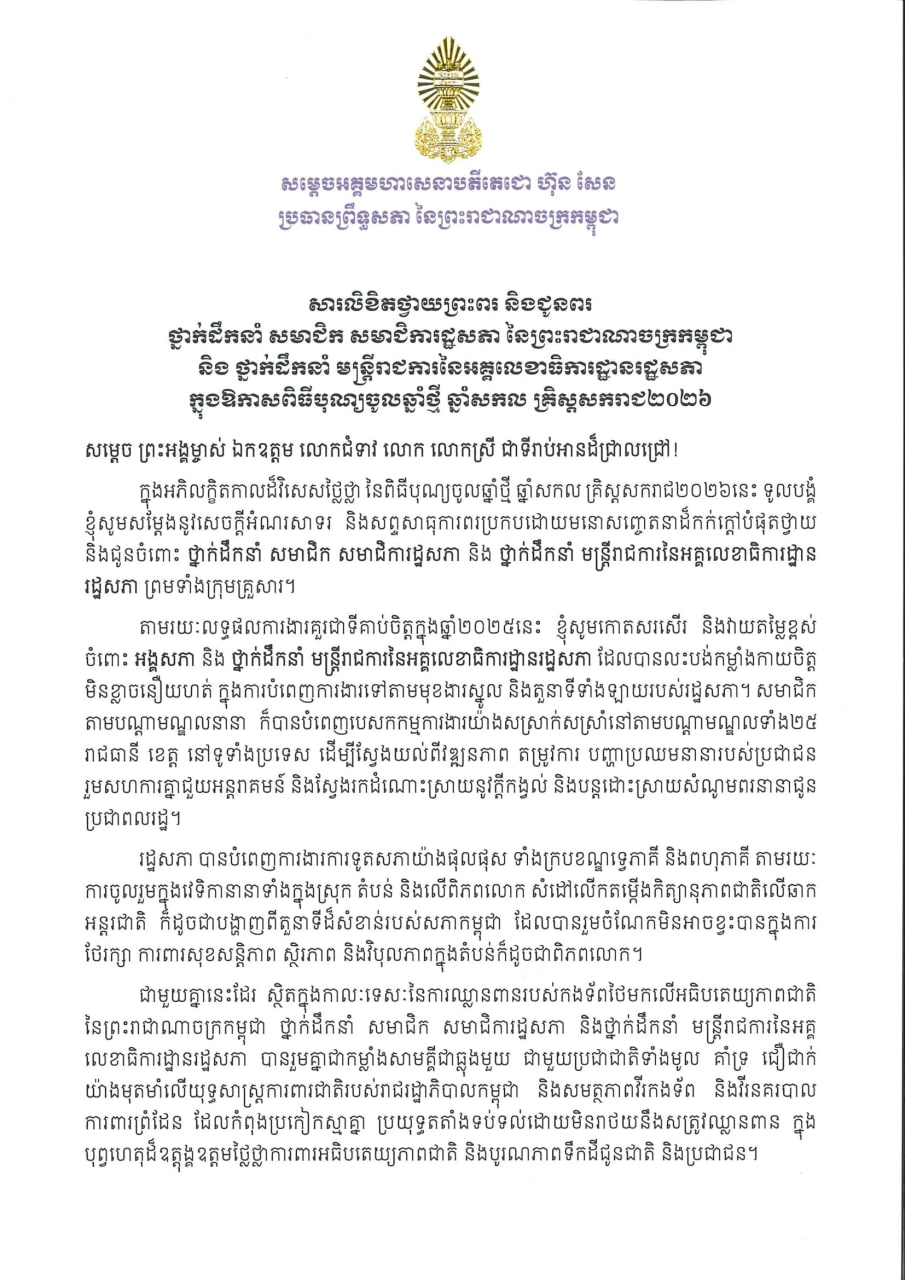 ក្នុងឱកាសដ៏មង្គលសួស្តី ប្រកបដោយមនោសញ្ចេតនាសោមនស្សរីករាយ នៃឆ្នាំថ្មី ឆ្នាំសកល គ្រិស្តសករាជ២០២៦នេះ ក្នុងនាមសមាជិក សមាជិកាព្រឹទ្ធសភា ព្រមទាំងថ្នាក់ដឹកនាំ មន្ត្រីរាជការនៃ អគ្គលេខាធិការព្រឹទ្ធសភា និងក្នុងនាមខ្លួនខ្ញុំផ្ទាល់ ខ្ញុំសូមចូលរួមសម្តែងនូវអំណរសាទរយ៉ាងកក់ក្តៅ និងសូមជូនពរជ័យ សិរីមង្គលវិបុលសុខដ៏មហាប្រសើរបំផុត។