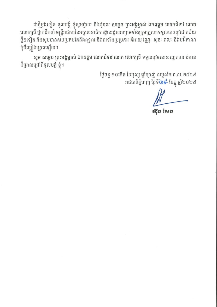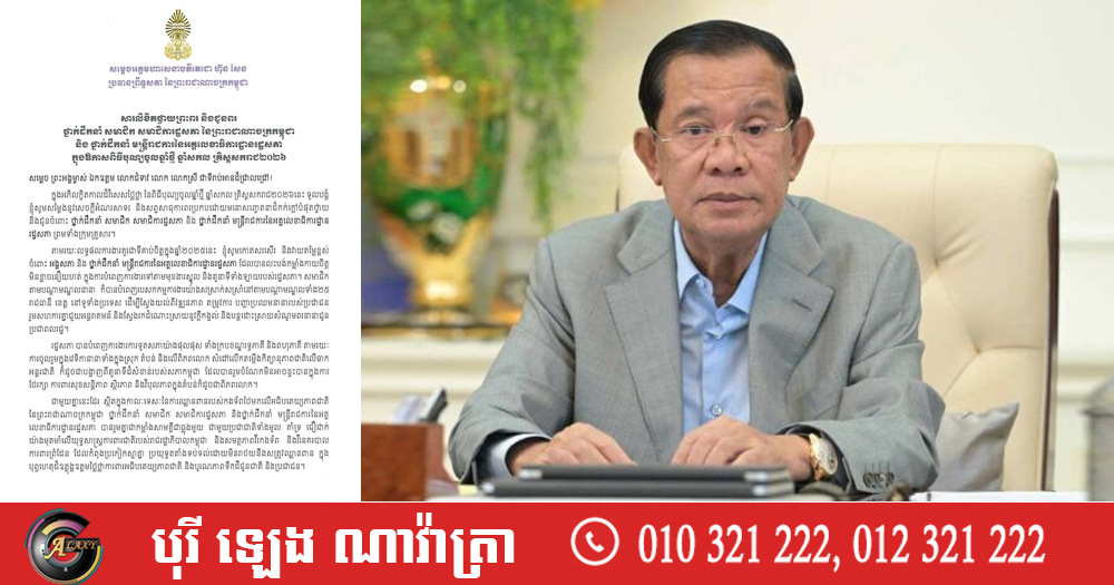 (ភ្នំពេញ)៖ សម្តេចអគ្គមហាសេនាបតីតេជោ ហ៊ុន សែន ប្រធានព្រឹទ្ធសភា នៃព្រះរាជាណាចក្រកម្ពុជា បានចេញសារលិខិតថ្វាយព្រះពរ និងជូនពរ ថ្នាក់ដឹកនាំ សមាជិក សមាជិការដ្ឋសភា និងថ្នាក់ដឹកនាំ មន្ដ្រីរាជការ នៃអគ្គលេខាធិការដ្ឋានរដ្ឋសភា ក្នុងឱកាសពិធីបុណ្យចូលឆ្នាំថ្មី ឆ្នាំសកល គ្រិស្តសករាជ ២០២៦។
