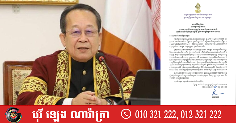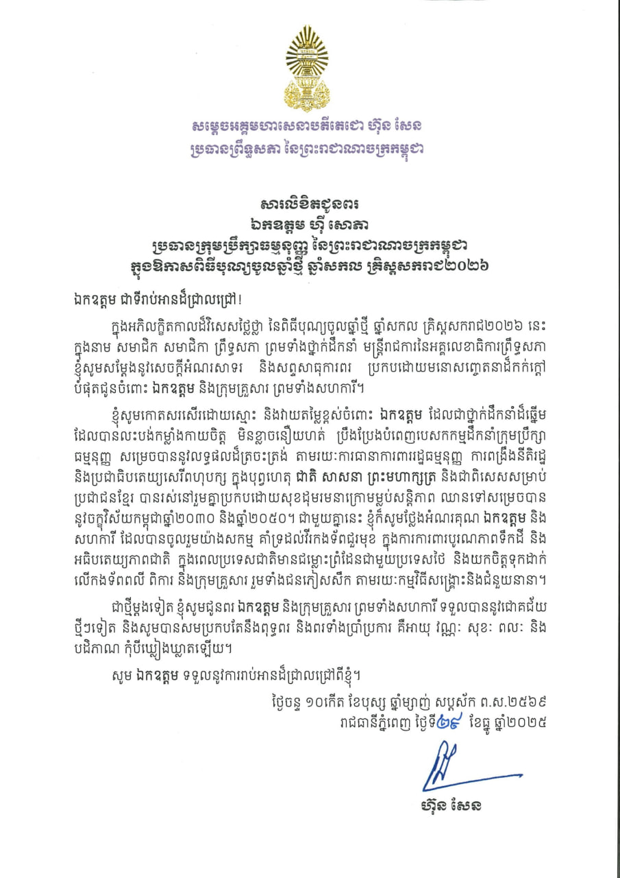 (ភ្នំពេញ)៖ សម្តេចអគ្គមហាសេនាបតីតេជោ ហ៊ុន សែន ប្រធានព្រឹទ្ធសភា នៃព្រះរាជាណាចក្រកម្ពុជា បានផ្ញើសារលិខិតជូនពរ ឯកឧត្ដម ហ៊ី សោភា ប្រធានក្រុមប្រឹក្សាធម្មនុញ្ញ នៃព្រះរាជាណាចក្រកម្ពុជា ក្នុងឱកាសពិធីបុណ្យចូលឆ្នាំថ្មី ឆ្នាំសកល គ្រិស្តសករាជ ២០២៦។