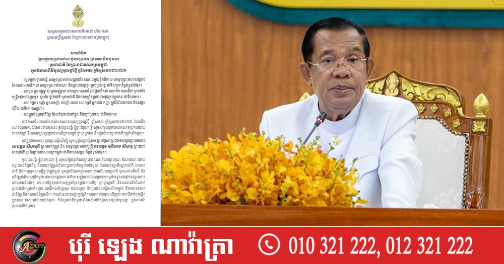 (ភ្នំពេញ)៖ សម្តេចអគ្គមហាសេនាបតីតេជោ ហ៊ុន សែន ប្រធានព្រឹទ្ធសភា នៃព្រះរាជាណាចក្រកម្ពុជា បានចេញសារលិខិតថ្វាយព្រះពរ និងជូនពរ ថ្នាក់ដឹកនាំ សមាជិក សមាជិកាព្រឹទ្ធសភា និងថ្នាក់ដឹកនាំ មន្ដ្រីរាជការ នៃអគ្គលេខាធិការដ្ឋានព្រឹទ្ធសភា ក្នុងឱកាសពិធីបុណ្យចូលឆ្នាំថ្មី ឆ្នាំសកល គ្រិស្តសករាជ ២០២៦។