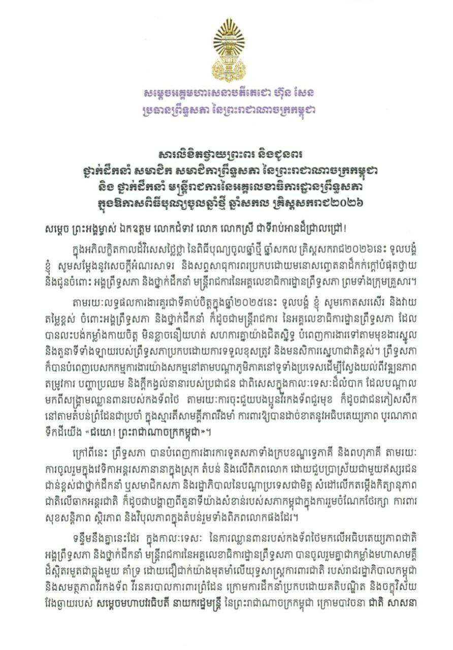 ក្នុងឱកាសដ៏មង្គលសួស្តី ប្រកបដោយមនោសញ្ចេតនាសោមនស្សរីករាយ នៃឆ្នាំថ្មី ឆ្នាំសកល គ្រិស្តសករាជ២០២៦នេះ ក្នុងនាមសមាជិក សមាជិកាព្រឹទ្ធសភា ព្រមទាំងថ្នាក់ដឹកនាំ មន្ត្រីរាជការនៃ អគ្គលេខាធិការព្រឹទ្ធសភា និងក្នុងនាមខ្លួនខ្ញុំផ្ទាល់ ខ្ញុំសូមចូលរួមសម្តែងនូវអំណរសាទរយ៉ាងកក់ក្តៅ និងសូមជូនពរជ័យ សិរីមង្គលវិបុលសុខដ៏មហាប្រសើរបំផុត។
