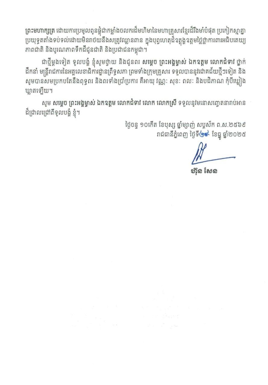 សម្តេចតេជោ ហ៊ុន សែន ចេញសារលិខិតថ្វាយព្រះពរ និងជូនពរ ថ្នាក់ដឹកនាំ សមាជិក សមាជិកាព្រឹទ្ធសភា និងថ្នាក់ដឹកនាំ មន្ដ្រីរាជការ នៃអគ្គលេខាធិការដ្ឋានព្រឹទ្ធសភា ក្នុងឱកាសពិធីបុណ្យចូលឆ្នាំថ្មី