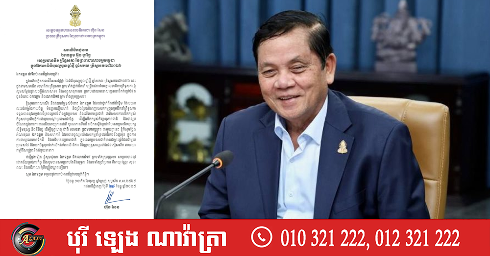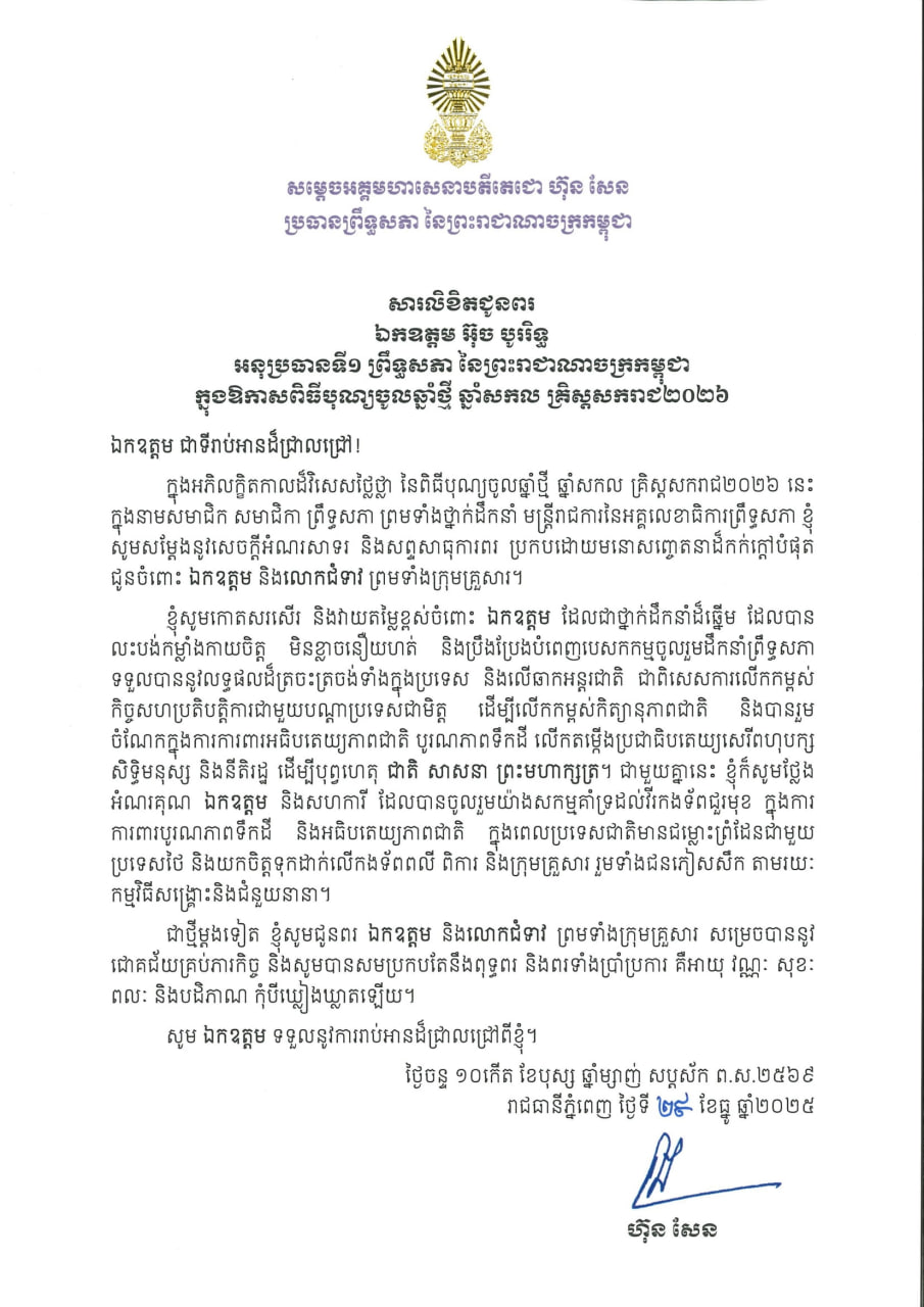 (ភ្នំពេញ)៖ សម្តេចអគ្គមហាសេនាបតីតេជោ ហ៊ុន សែន ប្រធានព្រឹទ្ធសភា នៃព្រះរាជាណាចក្រកម្ពុជា បានផ្ញើសារលិខិតជូនពរ ឯកឧត្ដម អ៊ុច បូររិទ្ធ អនុប្រធានទី១ ព្រឹទ្ធសភា នៃព្រះរាជាណាចក្រកម្ពុជា ក្នុងឱកាសពិធីបុណ្យចូលឆ្នាំថ្មី ឆ្នាំសកល គ្រិស្តសករាជ ២០២៦។