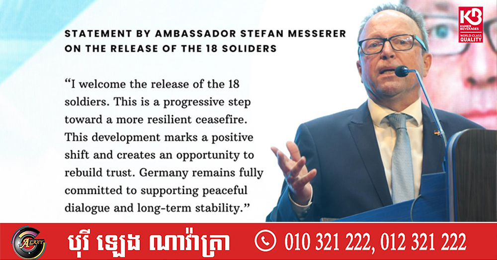 (ភ្នំពេញ)៖ លោក Stefan Messerer ឯកអគ្គរដ្ឋទូតនៃសាធារណរដ្ឋសហព័ន្ធអាល្លឺម៉ង់ ប្រចាំកម្ពុជា តាមរយៈសេចក្តីថ្លែងការណ៍នៅថ្ងៃទី៣១ ខែធ្នូ ឆ្នាំ២០២៥នេះ សូមស្វាគមន៍ចំពោះការដោះលែងទាហានរបស់កម្ពុជាទាំង ១៨រូប និងចាតុទុកថានេះគឺជាជំហានមួយឆ្ពោះទៅរកបទឈប់បាញ់ដែលកាន់តែរឹងមាំរវាងកងទ័ពកម្ពុជា និងថៃ។