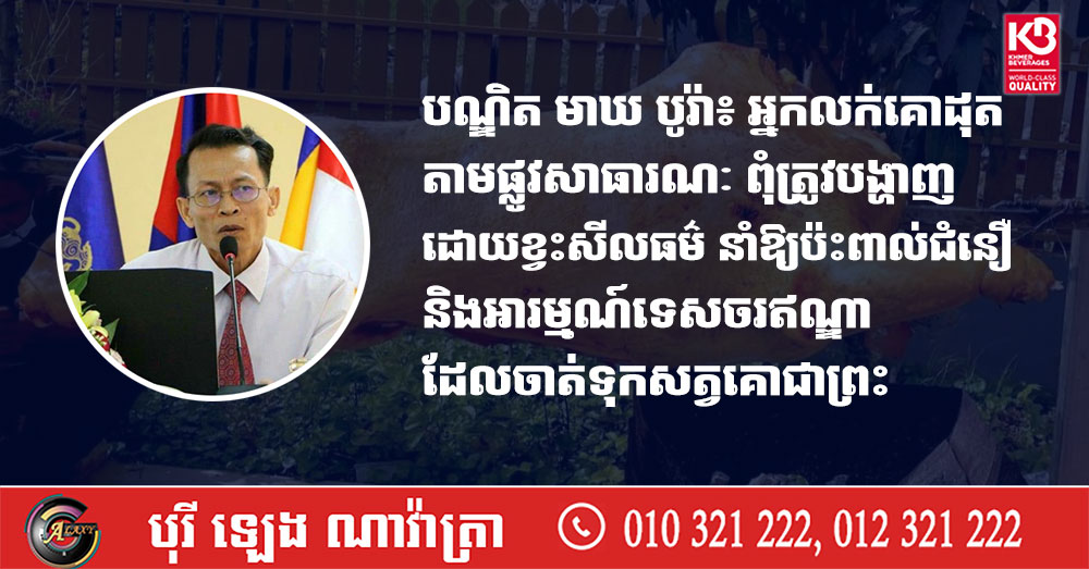 (ភ្នំពេញ)៖ លោកបណ្ឌិត មាឃ បូរ៉ា ប្រធានវិទ្យាស្ថានភាសាជាតិ តាមរយៈបណ្តាញព័ត៌មាន Fresh News នាថ្ងៃទី៣១ ខែធ្នូ ឆ្នាំ២០២៥ បានលើកឡើងថា អ្នកលក់សាច់គោ (គោដុត) តាមផ្លូវសាធារណៈ ពុំត្រូវបង្ហាញដោយខ្វះសីលធម៌ទេ នាំឱ្យប៉ះពាល់ដល់ជំនឿសាសនា និងអារម្មណ៍របស់ទេសចរជនជាតិឥណ្ឌា ដែលចាត់ទុកសត្វគោជាព្រះ។