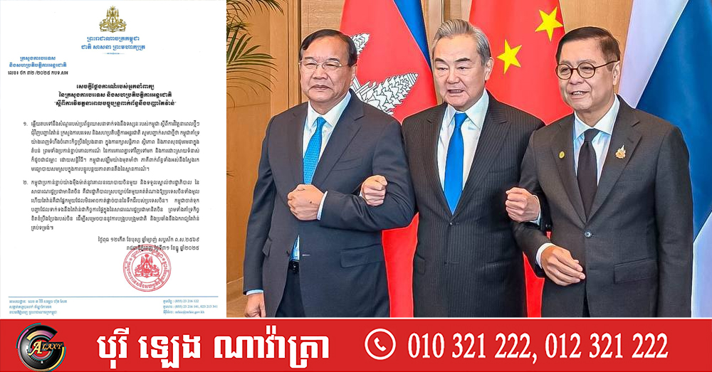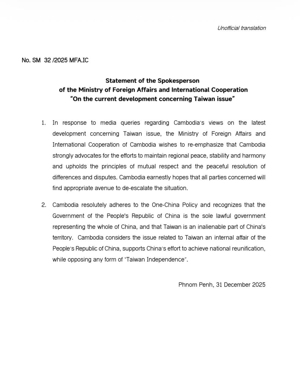 (ភ្នំពេញ)៖ ក្រសួងការបរទេស និងសហប្រតិបត្តិការអន្តរជាតិ នៃព្រះរាជាណាចក្រកម្ពុជា នៅថ្ងៃទី៣១ ខែធ្នូ ឆ្នាំ២០២៥ បានបញ្ជាក់ជំហរទទួលស្គាល់រដ្ឋាភិបាល នៃសាធារណរដ្ឋប្រជាមានិតចិន គឺជារដ្ឋាភិបាលស្របច្បាប់តែមួយគត់។