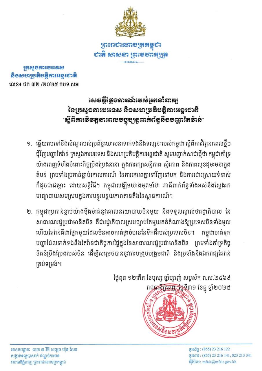 តាមរយៈសេចក្តីថ្លែងការណ៍របស់អ្នកនាំពាក្យ នៃក្រសួងការបរទេស និងសហប្រតិបត្តិការអន្តរជាតិ ស្តីពីការវិវត្តនាពេលបច្ចុប្បន្នពាក់ព័ន្ធនឹងបញ្ហាតៃវ៉ាន់ បានគូសបញ្ជាក់ដូចខាងក្រោម៖