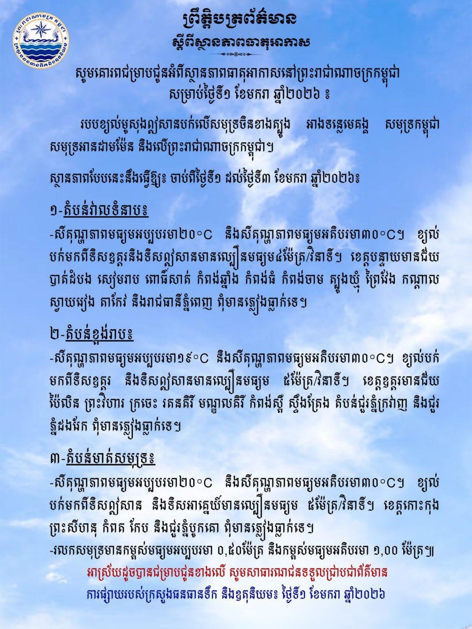 (ភ្នំពេញ)៖ ក្រសួងធនធានទឹក និងឧតុនិយម បានចេញសេចក្តីជូនដំណឹង អំពីស្ថានភាពធាតុអាកាសនៅកម្ពុជា សម្រាប់ថ្ងៃទី១ ខែមករា ឆ្នាំ២០២៦។
