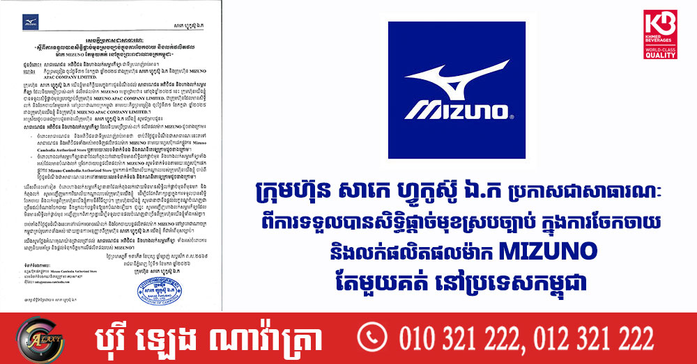 (ភ្នំពេញ)៖ ក្រុមហ៊ុន សាកេ ហ្វូកូស៊ូ ឯ.ក បានចេញសេចក្តីប្រកាសជាសាធារណៈ ស្តីពី «ការទទួលបានសិទ្ធិផ្តាច់មុខស្របច្បាប់ ក្នុងការចែកចាយ និងលក់ផលិតផល ម៉ាក MIZUNO តែមួយគត់នៅក្នុងព្រះរាជាណាចក្រកម្ពុជា»។