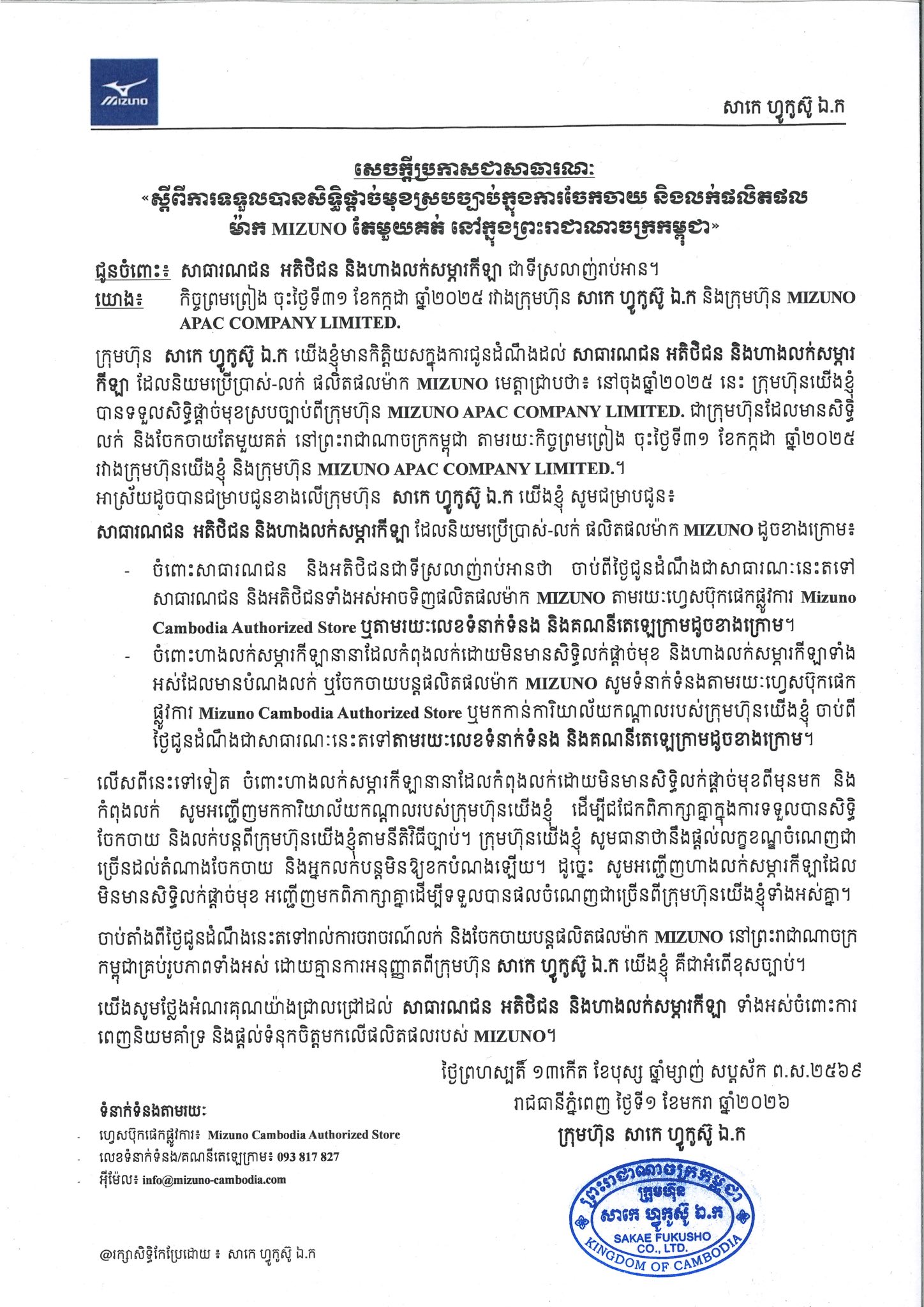 ក្រុមហ៊ុន សាកេ ហ្វូកូស៊ូ ឯ.ក បានឲ្យដឹងថា «នៅចុងឆ្នាំ២០២៥នេះ ក្រុមហ៊ុនយើងខ្ញុំ បានទទួលសិទ្ធិផ្តាច់មុខស្របច្បាប់ ពីក្រុមហ៊ុន MIZUNO APAC COMPANY LIMITED ជាក្រុមហ៊ុន ដែលមានសិទ្ធិលក់ និងចែកចាយតែមួយគត់នៅកម្ពុជា តាមរយៈកិច្ចព្រមព្រៀង ចុះថ្ងៃទី៣១ ខែកក្កដា ឆ្នាំ២០២៥ រវាងក្រុមហ៊ុនយើងខ្ញុំ និងក្រុមហ៊ុន MIZUNO APAC COMPANY LIMITED.»។