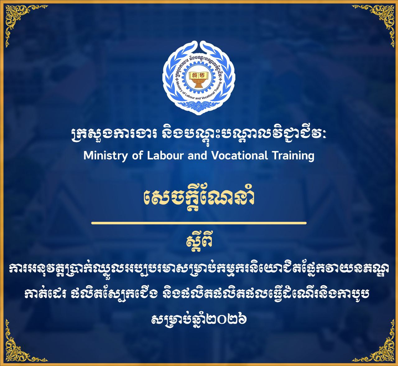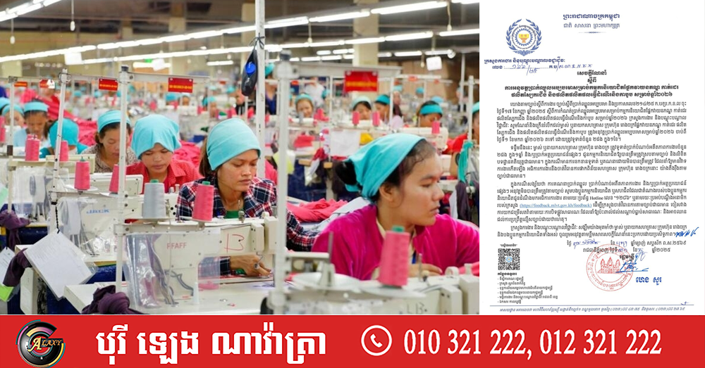 ក្រសួងការងារ ចេញសេចក្តីណែនាំស្តីពី ការអនុវត្តប្រាក់ឈ្នួលអប្បបរមាសម្រាប់កម្មករនិយោជិតផ្នែកវាយនភណ្ឌ កាត់ដេរ ផលិតស្បែកជើង និងផលិតផលិតផលធ្វើដំណើរនិងកាបូប សម្រាប់ឆ្នាំ២០២៦ (Video inside)