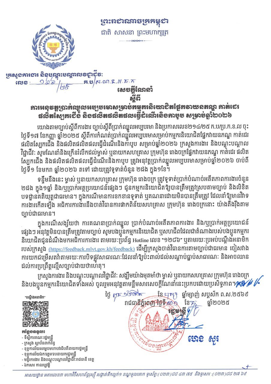 ជាមួយគ្នានេះដែរ ក្រសួងការងារ និងបណ្តុះបណ្តាលវិជ្ជាជីវៈ សូមណែនាំនិងក្រើនរំលឹកដល់ម្ចាស់ ឬនាយកសហគ្រាស ក្រុមហ៊ុន រោងចក្រផ្នែកវាយនភណ្ឌ កាត់ដេរ ផលិត ស្បែកជើង និងផលិតផលិតផលធ្វើដំណើរនិងកាបូប ត្រូវអនុវត្តប្រាក់ឈ្នួលអប្បបរមាសម្រាប់ឆ្នាំ២០២៦ ចាប់ពីថ្ងៃទី១ ខែមករា ឆ្នាំ២០២៦ តទៅដោយត្រូវទូទាត់ចំនួន ២ដង ក្នុង១ខែ។